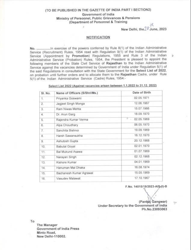 पदोन्नत होने वाले अधिकारियों में हनुमान मल ढाका, प्रियंका गोस्वामी, जगजीत सिंह मोगा, बचनेस अग्रवाल, राजेंद्र वर्मा, रामनिवास मेहता, डॉ अरुण गर्ग, किशोर कुमार, अल्फा चौधरी, संचिता विश्नोई, बाबूलाल गोयल, आशुतोष गुप्ता, हर्ष सावन बालमुकुंद असावा, नारायण सिंह और वासुदेव मालाबार शामिल है।