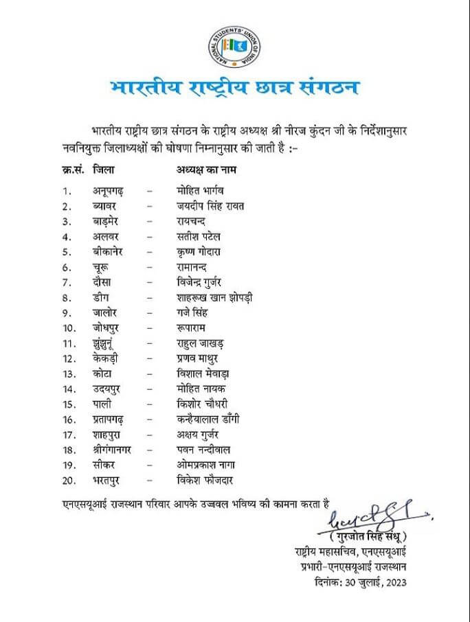 दिल्ली:-भारतीय राष्ट्र छात्र संगठन के राष्ट्रीय अध्यक्ष नीरज कुंदन के निर्देश के अनुसार राजस्थान के प्रभारी और राष्ट्रीय महासचिव गुरजोत सिंह सिंधु ने प्रदेश के 20 जिला अध्यक्ष घोषित किए हैं। विस्तार से देखें सूची में….
