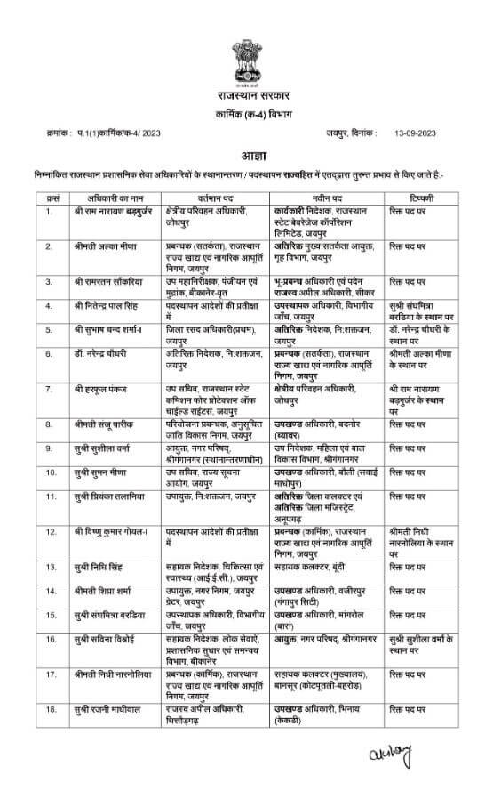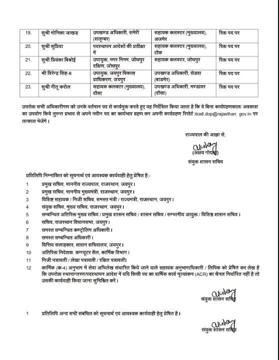मुख्यमंत्री अशोक गहलोत के निर्देश पर कार्मिक विभाग ने 23 राजस्थान प्रशासनिक सेवा (आरएएस) अधिकारियों के तबादले बुधवार देर रात को किए गए हैं। कार्मिक विभाग के संयुक्त शासन सचिव अक्षय गोदारा ने यह तबादला सूची जारी की है। विस्तार से देखें तबादला सूची में नाम…….