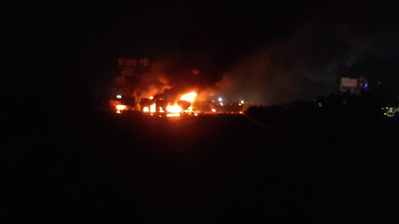 सूचना मिलते ही पुलिस अधिकारी दीपक खंडेलवाल मौके पर पहुंचे और सुरक्षा के लिए दोनों ओर का ट्रैफिक रोक दिया गया। दमकल की कई गाड़ियां आग बुझाने में जुटी हैं। फिलहाल किसी के हताहत होने की जानकारी नहीं मिली है।