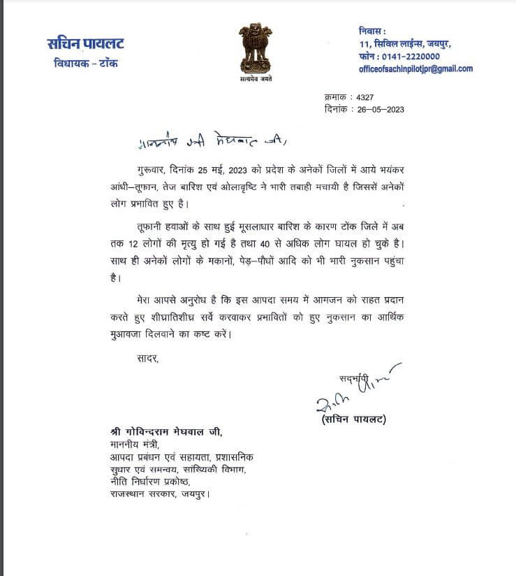 जयपुर:-टोंक से कांग्रेस विधायक सचिन पायलट में एक पत्र राहत मंत्री गोविंद सिंह मेघवाल को लिखकर उनके विधानसभा क्षेत्र में शुक्रवार 25 मई को अचानक हुई तेज बरसात और तूफान से 12 लोगों की मौत और 40 घायल लोगों को तत्काल राहत दिलाने की मांग की है।