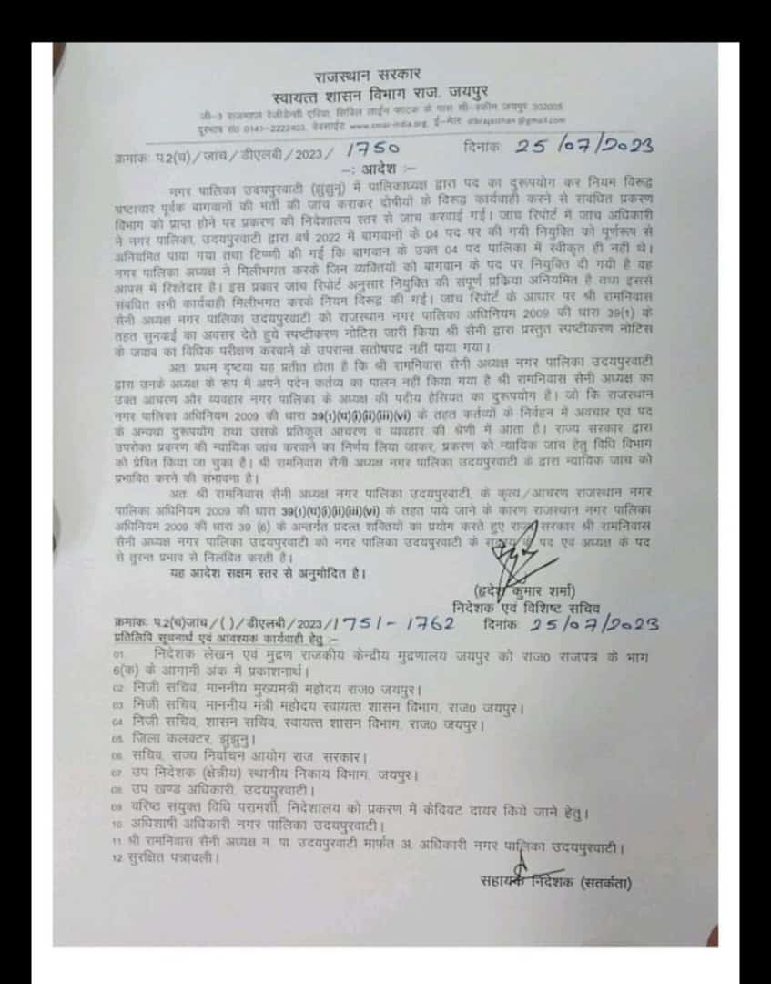 उदयपुरवाटी:-नगर पालिका में बागवानों की भर्ती में धांधलियों को लेकर किया सस्पेंड