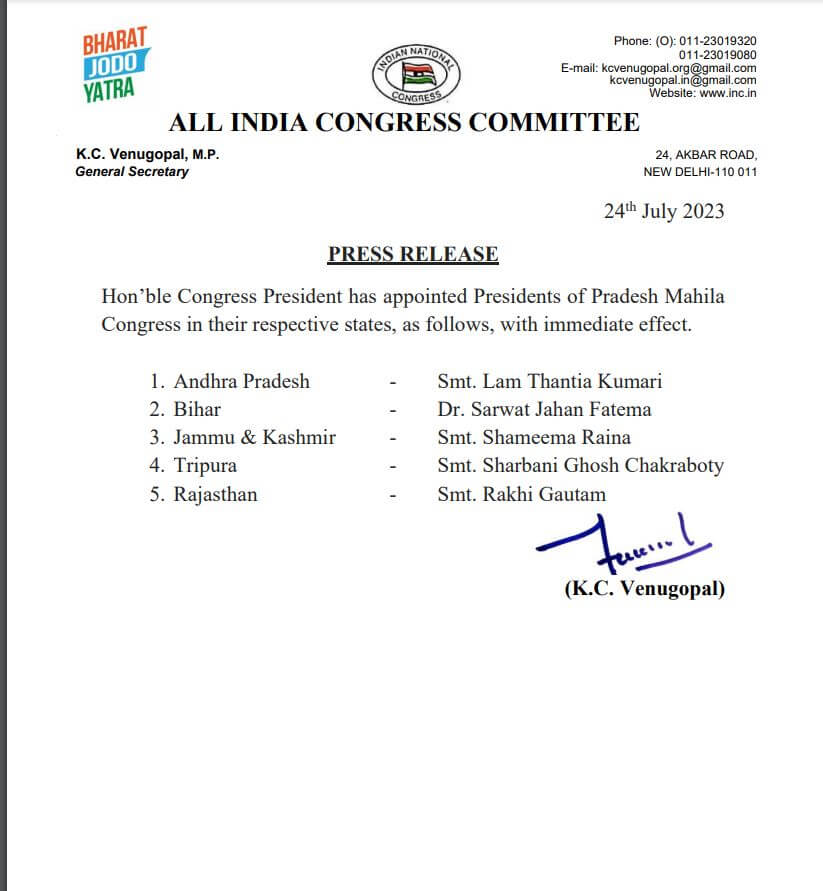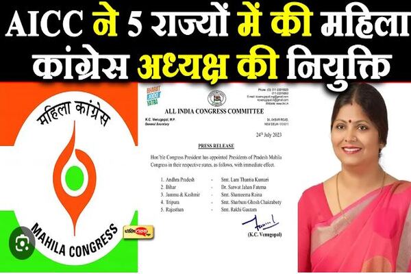 जयपुर:-अखिल भारतीय कांग्रेस कमेटी ने सोमवार को राजस्थान, आंध्र प्रदेश, बिहार, जम्मू कश्मीर और त्रिपुरा महिला कांग्रेस की अध्यक्ष घोषित की गई है। अखिल भारतीय कांग्रेस कमेटी के राष्ट्रीय संगठन महासचिव केसी वेणुगोपाल ने यह आदेश जारी किए हैं। आदेश के मुताबिक राजस्थान महिला कांग्रेस के अध्यक्ष राखी गौतम को बनाया है।