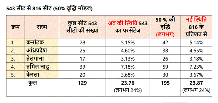 अमित शाह ने कहा कि यदि समग्र रूप से दक्षिण भारत के प्रतिनिधित्व को देखा जाए, तो वर्तमान में 543 सदस्यीय सदन में 129 सांसद दक्षिणी राज्यों से आते हैं, जो लगभग 23.76 प्रतिशत है। प्रस्तावित 50 प्रतिशत वृद्धि के बाद यह संख्या 129 से बढ़कर 195 हो जाएगी और 816 सदस्यीय सदन में उनका प्रतिनिधित्व लगभग 23.87 प्रतिशत, अर्थात लगभग 24 प्रतिशत हो जाएगा। इससे स्पष्ट है कि दक्षिणी राज्यों की कुल प्रतिनिधित्व क्षमता में वृद्धि होगी।