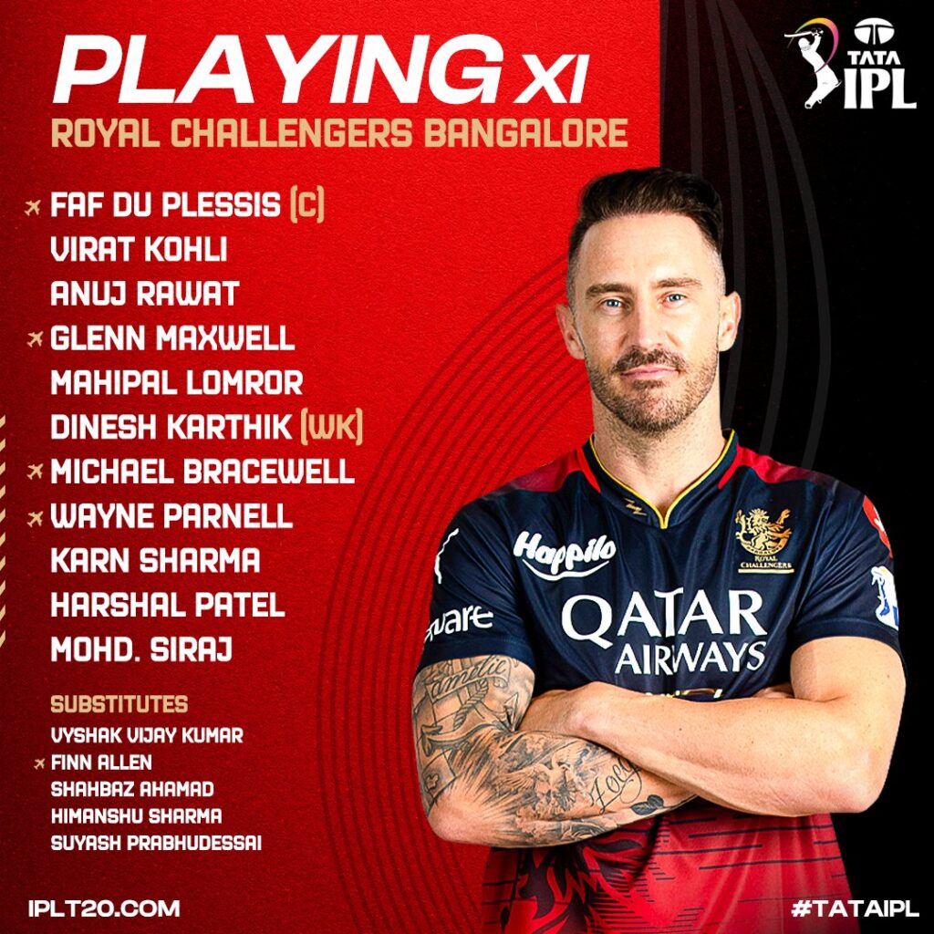 रॉयल चैलेंजर्स बेंगलुरु : फाफ डु प्लेसिस (कप्तान), विराट कोहली, अनुज रावत, ग्लेन मैक्सवेल, महिपाल लोमरोर, दिनेश कार्तिक (विकेटकीपर), माइकल ब्रेसवेल, वेन पार्नेल, कर्ण शर्मा, हर्षल पटेल और मोहम्मद सिराज।