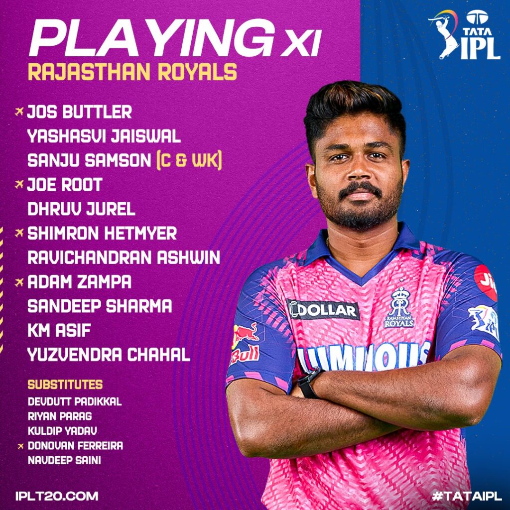 राजस्थान रॉयल्स : संजू सैमसन (कप्तान और विकेटकीपर), जोस बटलर, यशस्वी जायसवाल, जो रूट, ध्रुव जुरेल, शिमरोन हेटमायर, आर अश्विन, एडम जम्पा, संदीप शर्मा, केएम आसिफ और युजवेंद्र चहल।