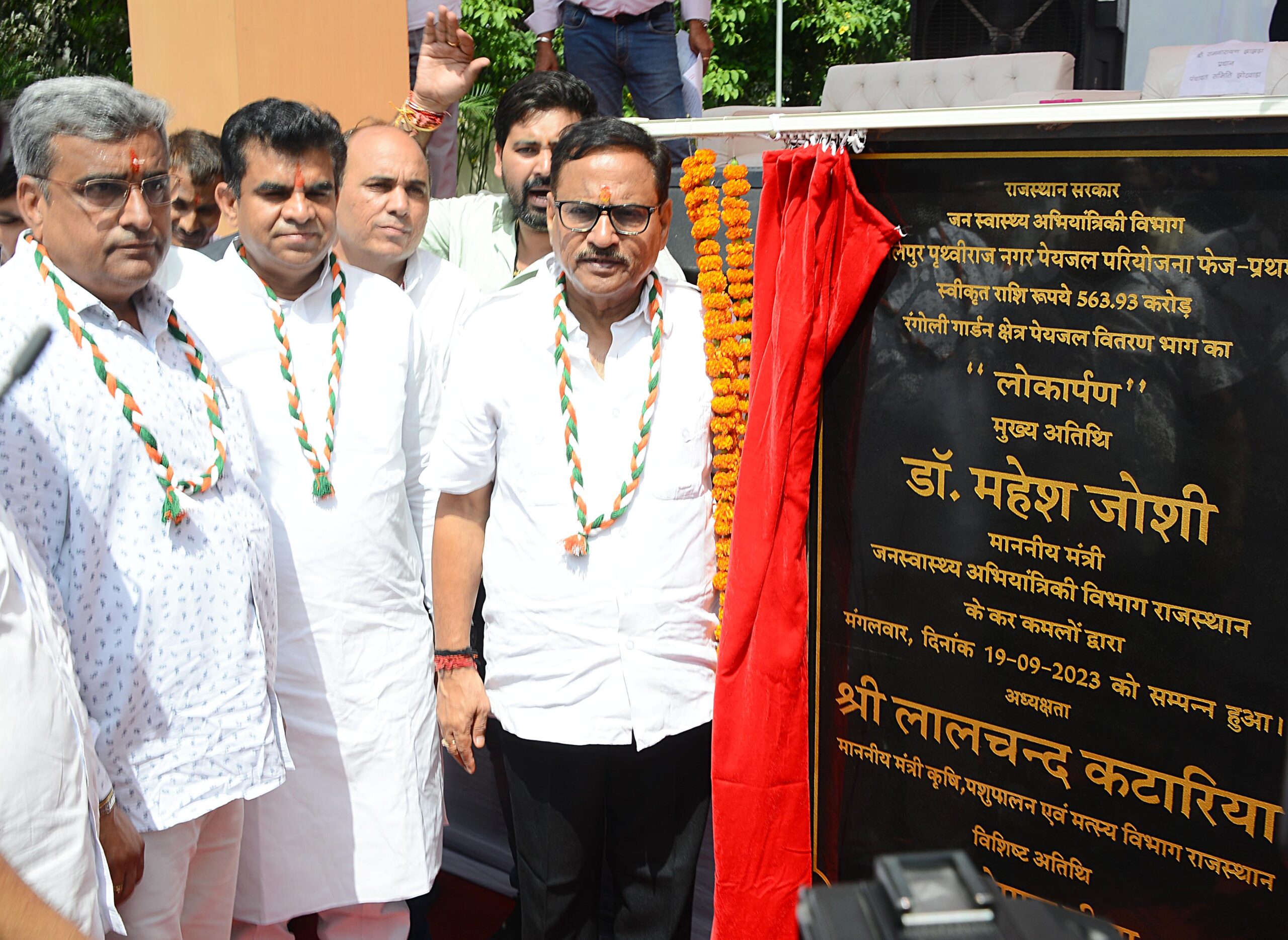 जयपुर,19 सितम्बर। बीसलपुर पृथ्वीराज नगर पेयजल परियोजना फेज-प्रथम के तहत रंगोली गार्डन क्षेत्र पेयजल वितरण पार्ट का लोकार्पण मंगलवार को जन स्वास्थ्य अभियांत्रिकी मंत्री डॉ. महेश जोशी ने यहां आयोजित एक कार्यक्रम में किया। डॉ. जोशी ने कृषि मंत्री एवं झोटवाड़ा विधायक लालचंद कटारिया के साथ पंप हाउस से पानी चलाकर रंगोली गार्डन वितरण क्षेत्र की 53 कॉलोनियों को पेयजल आपूर्ति की शुरूआत भी की।