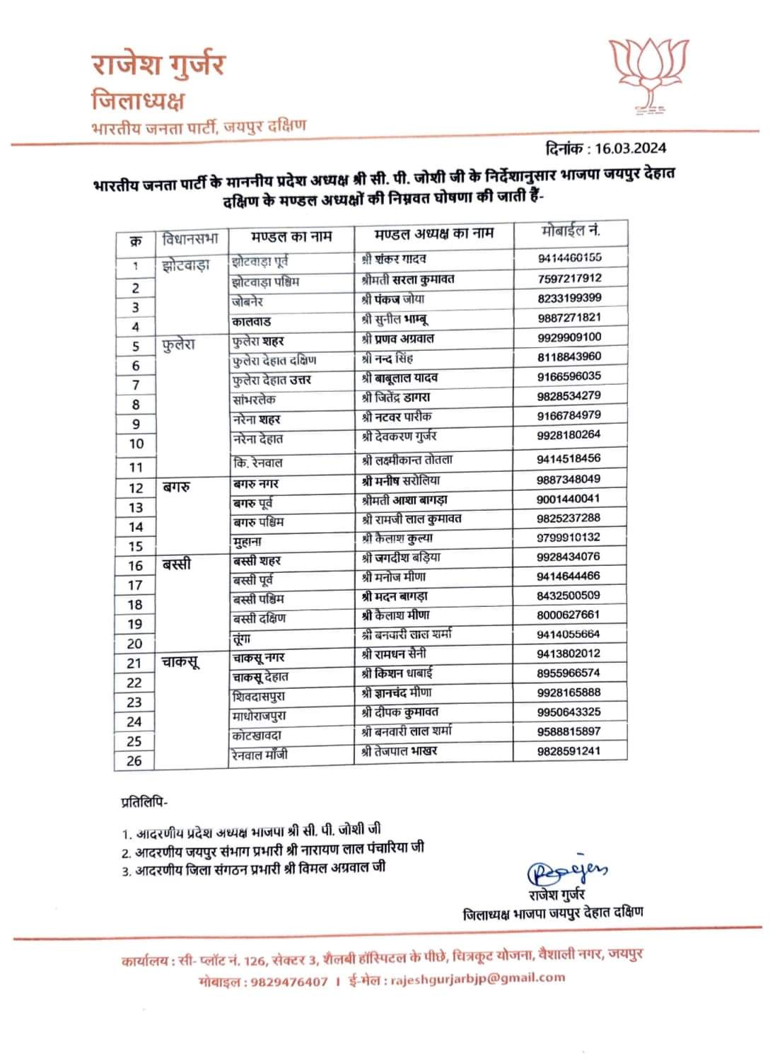 जयपुर:-भाजपा जयपुर देहात दक्षिण जिलाध्यक्ष राजेश गुर्जर ने शनिवार को जिले के पांच विधानसभाओं के 26 मंडल अध्यक्षों को तत्काल प्रभाव से बदला गया हैं। मनीष सेठी जयपुर देहात दक्षिण से जिला मीडिया संयोजक ने बताया की इनमें बगरू विधानसभा के सभी 4 मंडल अध्यक्ष बदले गए हैं। जिला कार्यालय प्रभारी जितेन्द्र सिंह ने बताया कि बगरू विधानसभा के बगरू नगर में मनीष सुरोलिया, बगरू पूर्व में आशा बागड़ा, बगरू पश्चिम में रामजीलाल कुमावत, मुहाना में कैलाश कुल्या को अध्यक्ष बनाया गया है तो वहीं, झोटवाडा विधानसभा के झोटवाड़ा पूर्व में शंकर यादव, झोटवाड़ा पश्चिम सरला कुमावत, जोबनेर में पंकज जोया, कालवाड़ में सुनील भाम्बू, फुलेरा विधानसभा के फुलेरा शहर प्रणव अग्रवाल, फुलेरा देहात दक्षिण नन्द सिंह, फुलेरा देहात उत्तर बाबूलाल यादव, सांभरलेक जिेन्द्र डागरा, नरेना शहर नटवर पारीक, नरेना देहात देवकरण गुर्जर, किशनगढ़ रेनवाल लक्ष्मीकांत तोतला, बस्सी विधानसभा के बस्सी शहर में जगदीश बड़िया, बस्सी पूर्व में मनोज मीणा, बस्सी पश्चिम में मदन बागड़ा, बस्सी दक्षिण में कैलाश मीणा, तूंगा में बनवारी लाल शर्मा, चाकसू विधानसभा के चाकसू नगर में रामधन सैनी, चाकसू देहात में किशन धाबाई, शिवदासपुरा में ज्ञानचंद मीणा, माधोराजपुरा में दीपक कुमावत, कोटखावदा में बनवारीलाल शर्मा रेनवाल मांजी में तेजपाल भाखर को अध्यक्ष बनाया गया है।