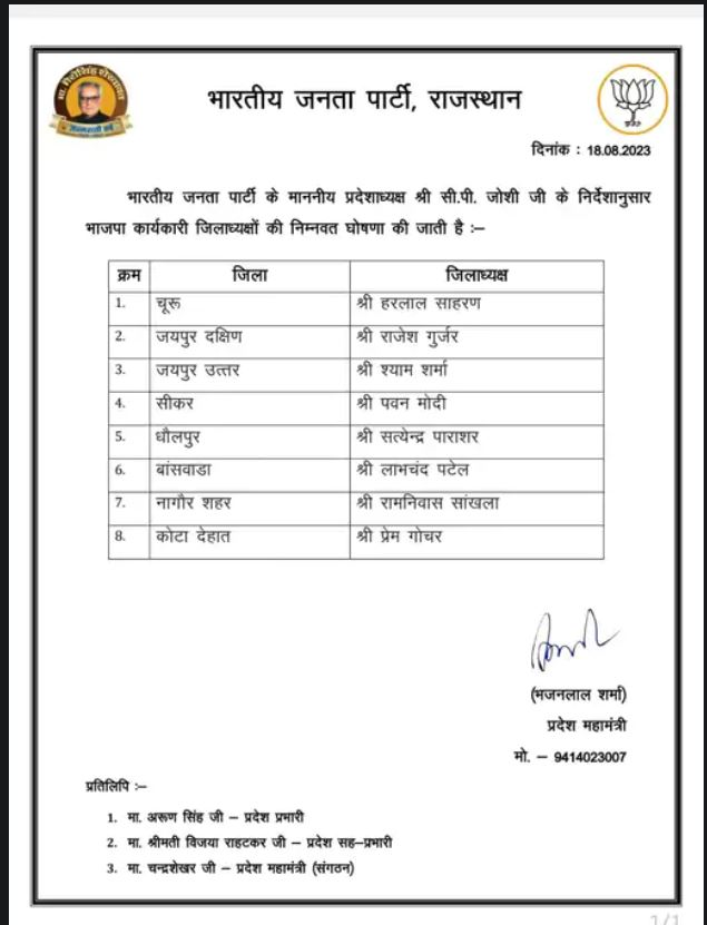 जयपुर:-भाजपा प्रदेश अध्यक्ष सीपी जोशी विधानसभा चुनाव को देखते हुए अपने संगठन में बदलाव अपने तौर तरीके से करना शुरू कर दिया है। उन्होंने शनिवार देर रात 8 जिलों के जिलाध्यक्ष बदल दिए। जिसमें जयपुर ग्रामीण के दो जिलाध्यक्ष भी शामिल है। इसमें जयपुर उत्तर में श्याम शर्मा व दक्षिण में राजेश गुर्जर को जिला अध्यक्ष बनाया गया है। भाजपा प्रदेश अध्यक्ष सीपी जोशी ने चुरू जिले में हरलाल सहारण, सीकर जिले में पवन मोदी, धौलपुर जिले में सत्येंद्र पराशर, बांसवाड़ा में लाभचंद पटेल, नागौर शहर में रामनिवास सांखला, कोटा देहात में प्रेम गोचर को जिला अध्यक्ष बनाया गया हैं। भाजपा प्रदेश अध्यक्ष सीपी जोशी ने प्रदेश कार्यसमिति के लिए की सदस्यों की घोषणा जिला अध्यक्षों के साथ-साथ प्रदेश कार्यसमिति के सदस्यों की भी घोषणा की गई हैं। धर्मवीर पुजारी, रामानंद गुर्जर, जितेंद्र शर्मा, इंद्रा चौधरी, श्रवण कुमार वर्मा, मोहनलाल चौधरी, गोविंद सिंह राव और मुकुट बिहारी नागर को प्रदेश कार्यसमिति में लिया गया हैं I