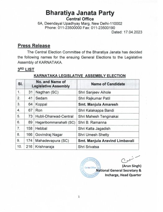 भाजपा की तीसरी लिस्ट में पार्टी ने महादेवपुरा से मंजुला अरविंद लिंबावली को अपना उम्मीदवार घोषित किया है। इसके अलावा 8 अन्य विधानसभा सीटों से पार्टी ने उम्मीदवारों के नाम तय कर दिए हैं। मालूम हो कि 224 विधानसभा सीट वाले कर्नाटक चुनाव के लिए भाजपा ने उम्मीदवारों की पहली सूची में 189 और दूसरी सूची में 23 उम्मीदवारों के नाम का ऐलान किया था।