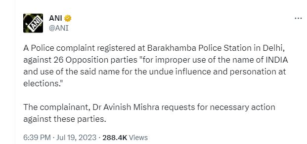 दिल्ली:-लोकसभा के वर्ष 2024 में होने वाले चुनाव में विपक्षी दलों के गठबंधन इंडियन नेशनल डेवलपमेंटल इन्क्लूसिव एलायंस INDIA नाम देने के मामले को लेकर विवाद खड़ा हो गया है। दिल्ली के रहने वाले अवनीश मिश्रा ने बाराखंबा थाने पर इन 26 दलों के खिलाफ मामला दर्ज कराया है। उनका कहना है कि Emblems Act उल्लंघन किया गया है कोई भी निजी फायदे के लिए देश का नाम प्रयोग नहीं किया जा सकता है। उन्होंने अपनी शिकायत में बेंगलुरु में मीटिंग में शामिल सभी 26 दलों के को टारगेट बनाया है।