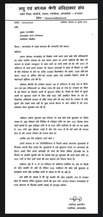 भाजपा के नेताओं और कार्यकर्ताओं ने आरोप लगाया है कि एक पत्र सोशल मीडिया पर वायरल किया गया जिसमें सरकार पर 50% कमीशन खाने की बात कही गई है।भाजपा के नेता और कार्यकर्ताओं नेज्ञानेश अवस्थी के नाम भी केस दर्ज किया है यह लेटर जो वायरल किया गया है जिसमें लघु एवं मध्यम क्षेत्रीय संविदा कार संघ के लेटर पैड पर यह आरोप जारी किया हुआ है। इसी को आधार बनाकर कांग्रेस के नेताओं ने मध्य प्रदेश की भाजपा सरकार पर यह आरोप लगाया है। यह पत्र हाईकोर्ट की ग्वालियर खंडपीठ के मुख्य न्यायाधीश के नाम लिखा गया था।भोपाल की क्राइम ब्रांच और इंदौर के संयोगितागंज थाने में केस दर्ज किया गया है।