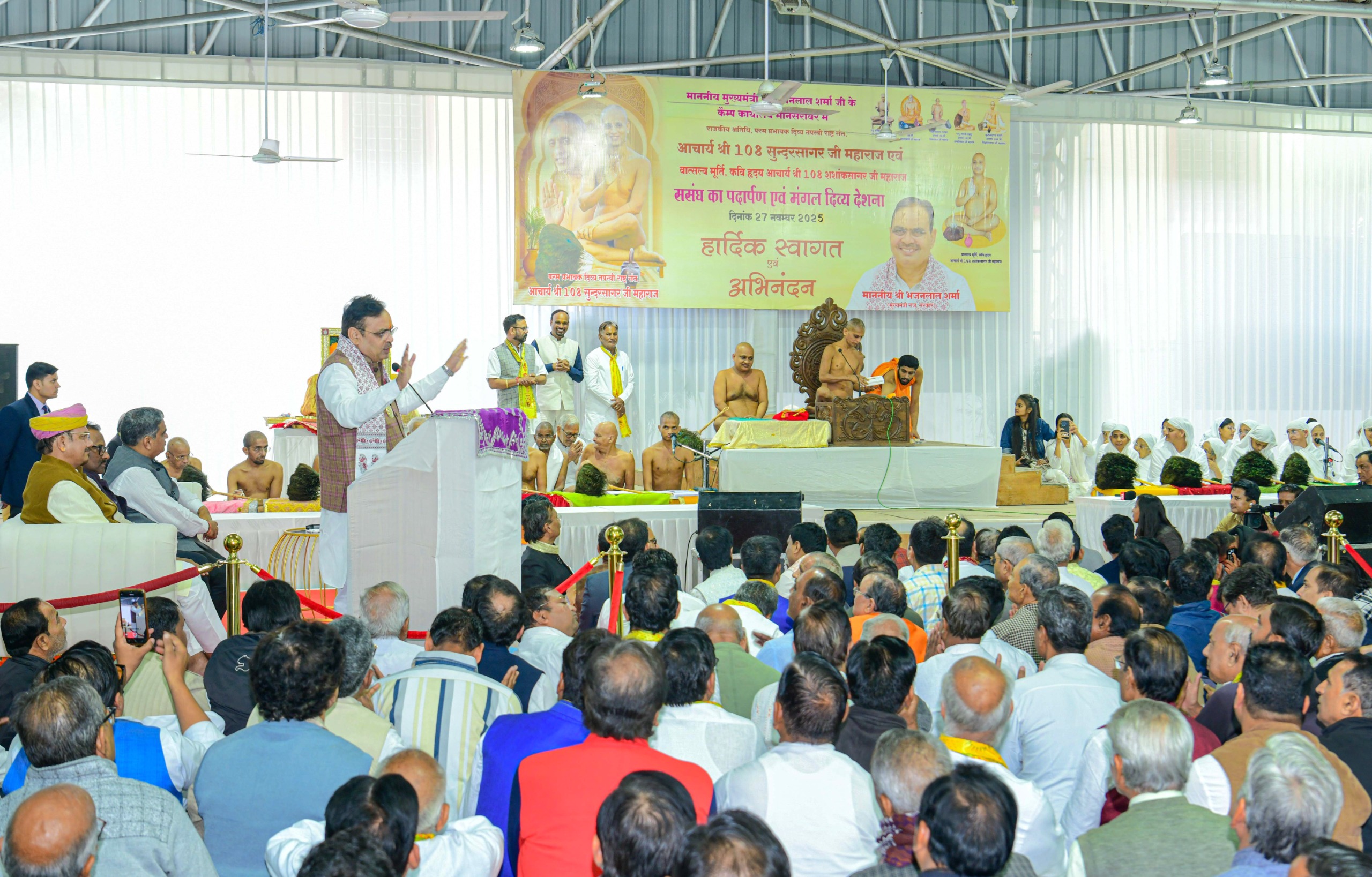 मुख्यमंत्री भजनलाल शर्मा ने सभी संतो की पद वंदना करते हुए उनका हाथ थामे एसएफएस मानसरोवर स्थित आदिनाथ मंदिर से सांगानेर कैम्प कार्यालय के कार्यक्रम में लेकर आए। इस दौरान मार्ग में पुष्प वर्षा एवं बैंड वादन कर उनका स्वागत-अभिनंदन किया गया। कार्यक्रम में शर्मा को ‘मातृ भू सेवक’ की मानद उपाधि से अलंकृत भी किया गया। इससे पहले शर्मा ने एसएफएस मानसरोवर स्थित श्री आदिनाथ मंदिर में दर्शन कर प्रदेश की सुख समृद्धि एवं खुशहाली की कामना की।