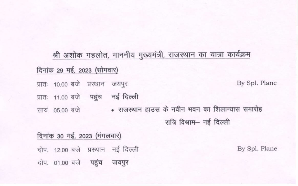 सीएम गहलोत जयपुर एयरपोर्ट से प्रातः 10:00 रवाना होकर प्रातकाल 11:00 दिल्ली पहुंचेंगे। सीएम गहलोत शाम 5:00 बजे राजस्थान हाउस के नए भवन के शिलान्यास कार्यक्रम में हिस्सा लेंगे। इस कार्यक्रम से पहले सीएम गहलोत का दिल्ली में किस से मुलाकात का कार्यक्रम है यह स्पष्ट नहीं बताया गया है। यह भी माना जा रहा है कि अखिल भारतीय कांग्रेस कमेटी के अध्यक्ष मलिकार्जुन खरगे से उनकी मुलाकात हो सकती है। उन्होंने सीएम गहलोत को मुलाकात के लिए 29 मई को तलब कर रखा है।