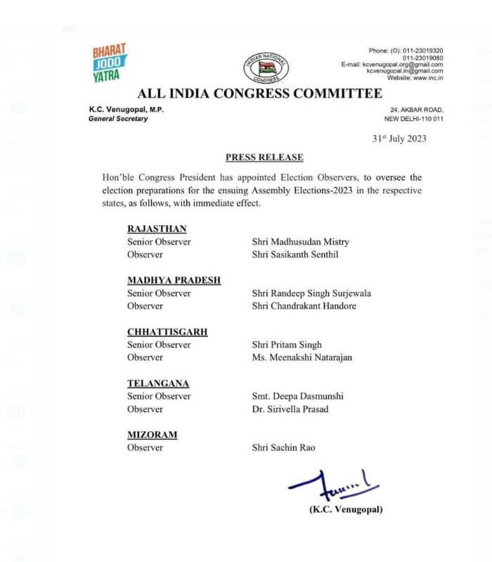 एआईसीसी ने छत्तीसगढ़, मध्य प्रदेश, तेलंगाना और मणिपुर के लिए भी ऑब्जर्वर नियुक्त किया। देखें सूची…..