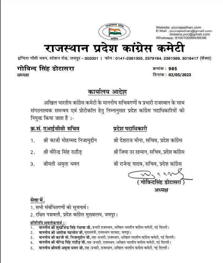 जयपुर:-राजस्थान प्रदेश कांग्रेस कमेटी के अध्यक्ष गोविन्द सिंह डोटासरा ने अखिल भारतीय कांग्रेस कमेटी के राजस्थान सहप्रभारी सचिवगणों के साथ संगठनात्मक समन्वय और प्रोटोकॉल के लिए प्रदेश कांग्रेस कमेटी के पदाधिकारियों को सहयोग के लिए लगाया है।
