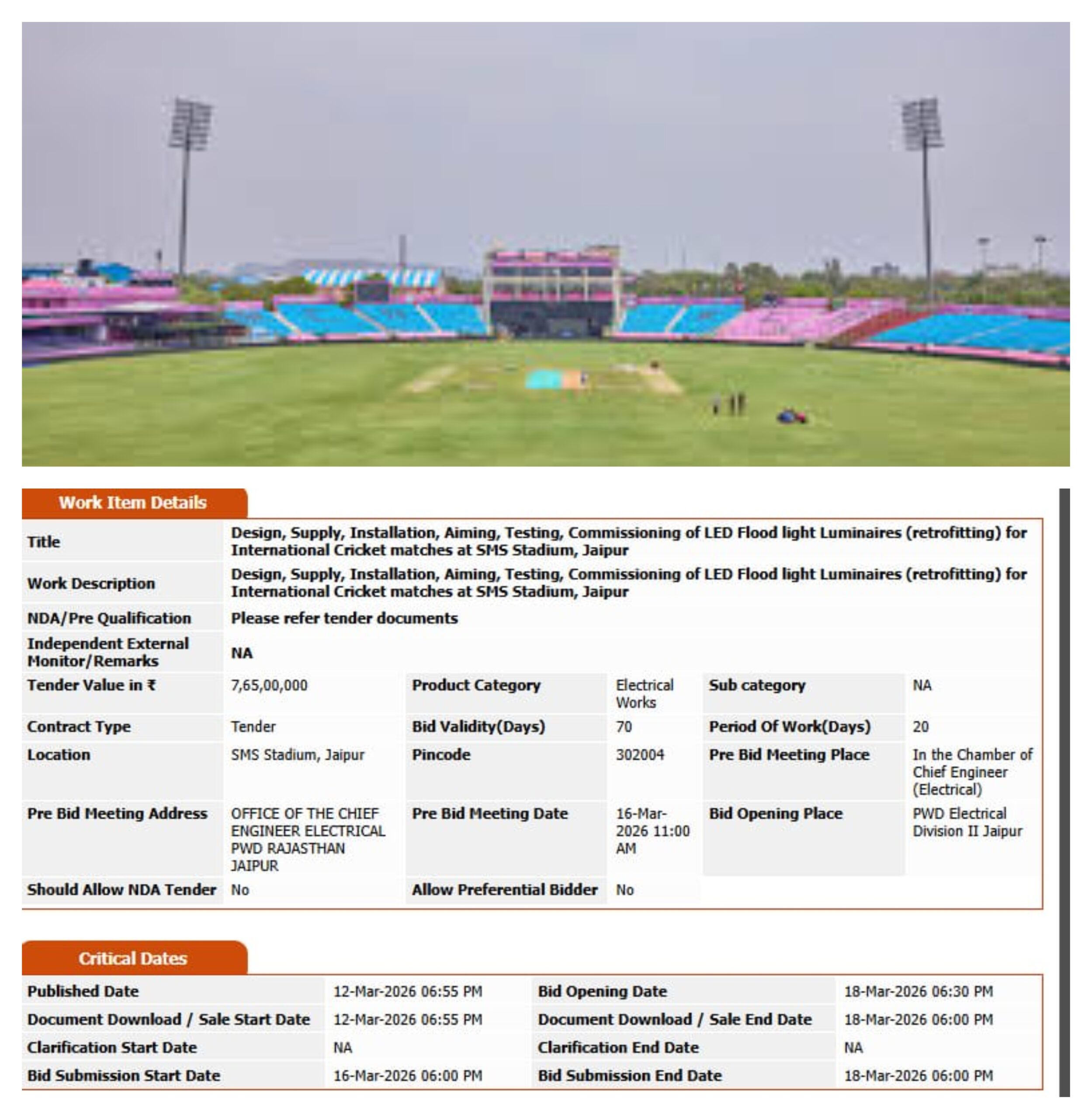 जयपुर: जयपुर में प्रस्तावित IPL मैचों के आयोजन से पहले एसएमएस स्टेडियम में फ्लडलाइट्स बदलने के लिए जारी किए गए टेंडर पर अब सवाल खड़े होने लगे हैं। आरोप है कि सार्वजनिक निर्माण विभाग (PWD) द्वारा प्रकाश व्यवस्था का कार्य अत्यधिक जल्दबाजी में कराया जा रहा है, जिससे गुणवत्ता और पारदर्शिता दोनों पर संदेह उत्पन्न हो गया है।