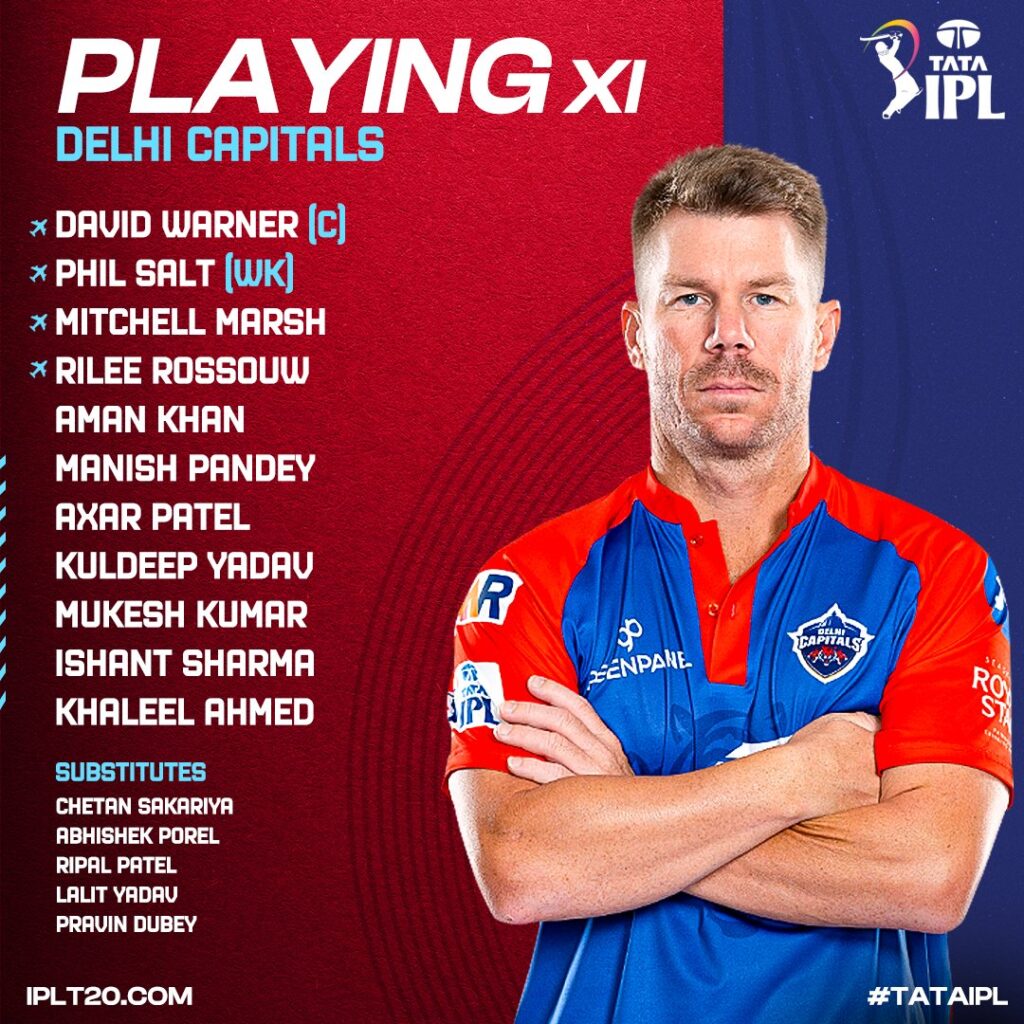 दिल्ली कैपिटल्स : डेविड वार्नर (कप्तान), फिलिप साल्ट (विकेटकीपर), मिचेल मार्श, रिले रोसौव, मनीष पांडे, अमन हकीम खान, अक्षर पटेल, कुलदीप यादव, मुकेश कुमार, इशांत शर्मा और खलील अहमद।