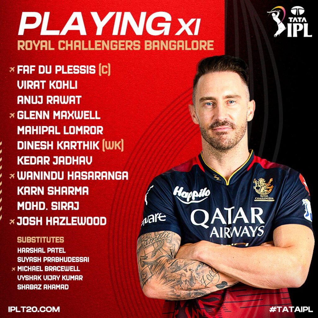 रॉयल चैलेंजर्स बैंगलोर: विराट कोहली, फाफ डु प्लेसिस (कप्तान), अनुज रावत, ग्लेन मैक्सवेल, महिपाल लोमरोर, दिनेश कार्तिक (विकेटकीपर), केदार जाधव, वानिंदु हसरंगा, कर्ण शर्मा, मोहम्मद सिराज और जोश हेजलवुड।