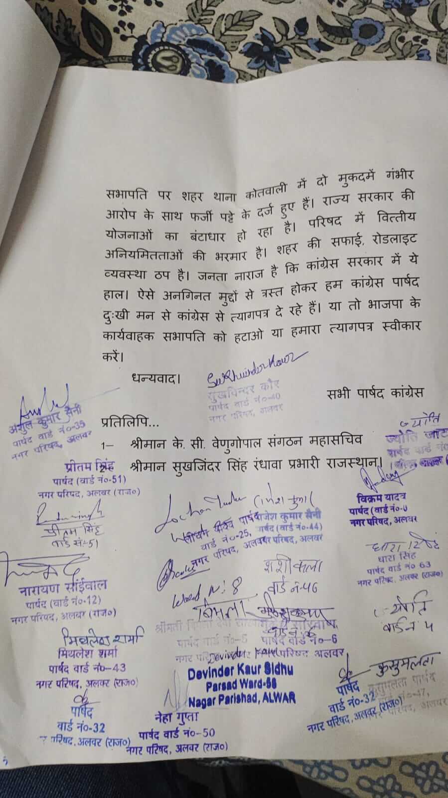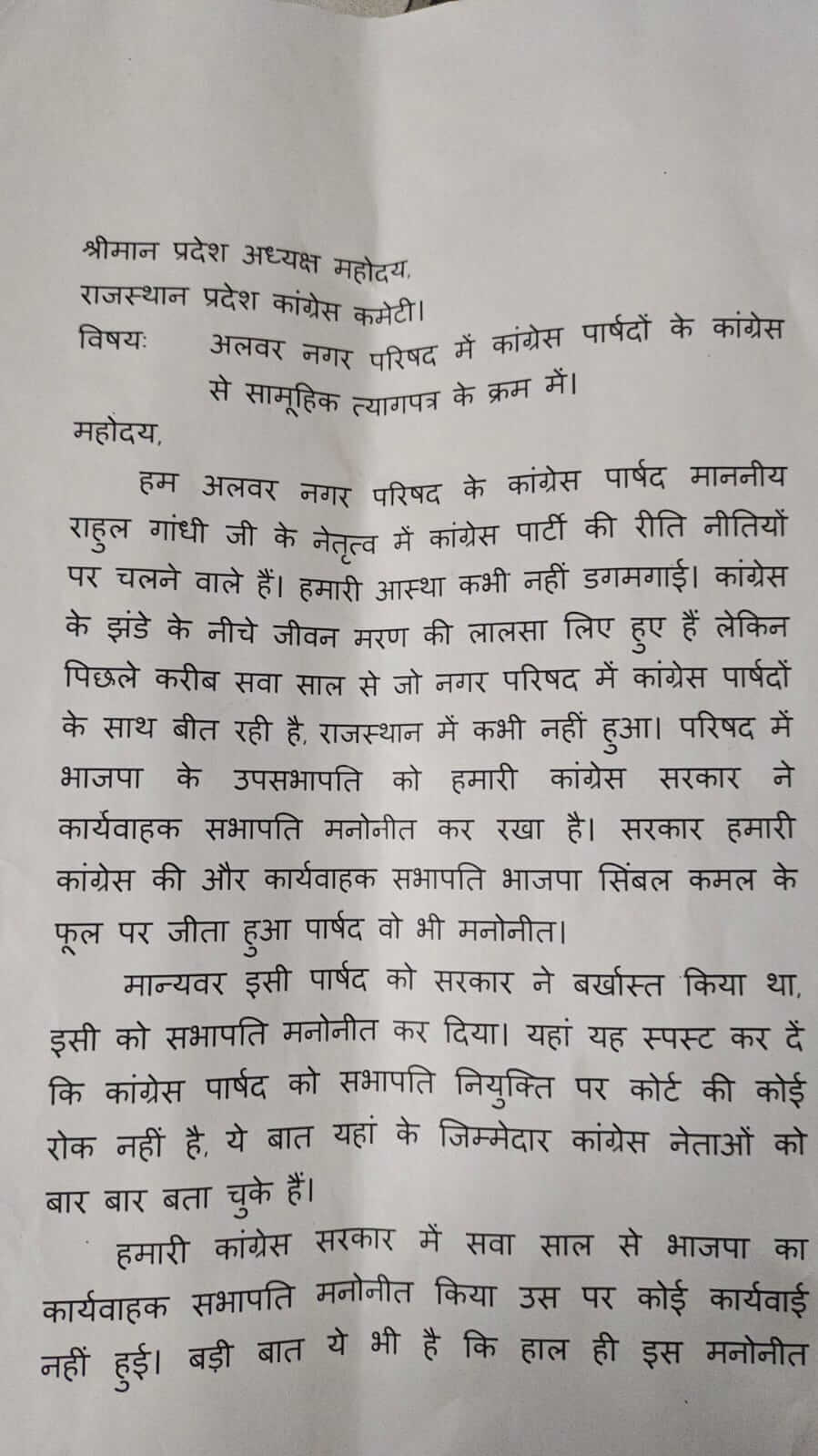 नाराज पार्षद प्रदेश प्रभारी सुखजिंदर सिंह रंधावा और प्रदेश अध्यक्ष गोविंद सिंह डोटासरा से मिलकर अपना सामूहिक इस्तीफा सौंपेंगे। पार्षदों का कहना है कि जब सत्ता में कांग्रेस की सरकार है उसके बावजूद भी हमारी प्रतिपक्ष भाजपा के लोग हम पर हावी हैं। कांग्रेस के पार्षदों का स्पष्ट रूप से कहना है कि नगर परिषद से भाजपा के पार्षद को कार्यवाहक सभापति से हटाया जाए जो डेढ़ साल से मनोनीत है। कोर्ट का कोई हस्तक्षेप नहीं है, इस पर हालही फर्जी पट्टा देने के दो मुकदमे दर्ज है। अलवर नगर परिषद में कांग्रेस के सभी पार्षद विद्रोह की तैयारी में है। पूरे जिले के कांग्रेसी इनका साथ दे रहे हैं। अगर ये कांग्रेस छोड़ते हैं तो पार्टी को बड़ा नुकसान हो सकता है है। इनका कहना है कि भाजपा सिंबल से जीते पार्षद से चार्ज वापस लिया जाए और कांग्रेस पार्षद को सभापति मनोनीत किया जाए। ऐसा नहीं हुआ तो कांग्रेस छोड़ देंगे।