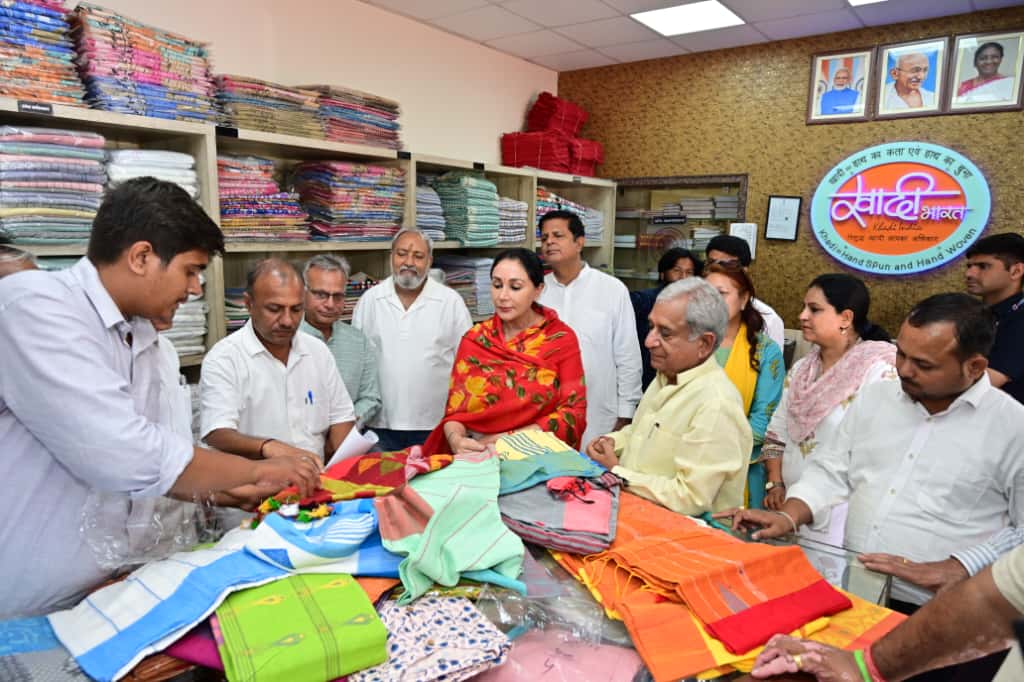 जयपुर। उपमुख्यमंत्री दिया कुमारी ने बजाज नगर स्थित खादी ग्रामोद्योग भवन में पहुँचकर खादी उत्पादों की खरीदारी की और आमजन को स्वदेशी अपनाने का संदेश दिया। उन्होंने खादी वस्त्रों का अवलोकन करते हुए कहा कि “हमें विदेशी उत्पादों की बजाय देश में बने हुए स्वदेशी वस्तुओं को प्राथमिकता देनी चाहिए।”