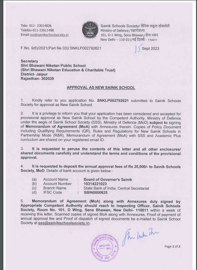 जयपुर:-जयपुर सांसद रामचरण बोहरा के प्रयास रंग लाए केंद्र सरकार ने जयपुर को सैनिक स्कूल की सौगात दी। देर रात रक्षा मंत्रालय ने आदेश जारी कर जयपुर के भवानी निकेतन शिक्षण संस्थान में सैनिक स्कूल बनाने के प्रस्ताव को मंजूरी दी। जयपुर में खुलने वाला प्रदेश का चौथा सैनिक स्कूल होगा। सैनिक स्कूल के लिए भाजपा सांसद रामचरण बोहरा के प्रयासों का ही प्रतिफल है। भाजपा सांसद बोहरा पिछले कई वर्षों से जयपुर में सैनिक स्कूल बनवाने का प्रयास कर रहे थे। उन्होंने कई बार इस विषय में रक्षा मंत्री राजनाथ सिंह से भी मुलाकात की। भाजपा सांसद बोहरा ने संसद के पटल पर भी जयपुर में सैनिक स्कूल बनवाने की मांग रखी थी। भाजपा सांसद बोहरा ने सैनिक स्कूल की सौगात देने के लिए प्रधानमंत्री नरेंद्र मोदी एवं रक्षा मंत्री राजनाथ सिंह को धन्यवाद दिया। भाजपा सांसद बोहरा ने कहा कि जयपुरवासियों के लिए बड़े हर्ष का विषय हैं जयपुर में सैनिक स्कूल बनने जा रहा है। सैनिक स्कूल का सबसे बड़ा फायदा उन विद्यार्थियों को मिलेगा जो देश की सेना में भर्ती होना चाहते हैं और मातृभूमि की सेवा करना चाहते हैं। उन्हें सैनिक स्कूल में शिक्षा प्राप्त करने के लिए झुंझुनू या चित्तौड़गढ़ नहीं जाना पड़ेगा। भाजपा सांसद बोहरा ने कहा कि सैनिक स्कूल छात्रों को अपनी कड़ी मेहनत से भारत माता की सेवा के लिए तैयार करेगा। इस स्कूल से भारत माता की सेवा करने वाले छात्र निकलेंगे। यह स्कूल छात्रों को सुरक्षा, देशभक्ति और शौर्य के बारे में सीखने में सहायता करेगा। जयपुर राजस्थान की राजधानी है इसलिए यहां संपूर्ण राजस्थान ही नहीं अपितु आसपास के अन्य राज्यों से भी विद्यार्थी शिक्षा ग्रहण करने आते हैं। सैनिक स्कूल बनने से जयपुर के साथ साथ अन्य राज्यों के विद्यार्थियों को भी लाभ होगा। उल्लेखनीय है कि भवानी निकेतन पब्लिक स्कूल परिसर को सैनिक स्कूल के रूप में मान्यता दी है। इस तरह ये प्रदेश का तीसरा सैनिक स्कूल होगा। इसमें प्रवेश की प्रक्रिया अगले शैक्षणिक सत्र से होगी।भवानी निकेतन शिक्षा समिति के अध्यक्ष शिवपाल सिंह नांगल ने बताया कि अगले 7 दिन में हमारा सैनिक स्कूल सोसायटी के साथ एमओयू हो जाएगा। इसके बाद एडमिशन की प्रक्रिया शुरू होगी। इस स्कूल में 100 सीटें रहेगी, जिसमें से 40 सीटों पर एडमिशन भवानी निकेतन सोसायटी की अनुशंसा पर होगा। स्कूल में भर्ती की प्रक्रिया और काउंसलिंग सैनिक स्कूल सोसायटी के जरिए ही होगा, जबकि स्कूल में पढ़ाने वाला स्टाफ और इन्फ्रास्ट्रक्चर भवानी निकेतन सोसायटी का होगा। उन्होंने बताया कि 2 साल जयपुर में सैनिक स्कूल खोलने के प्रयास किया जा रहा थे, जिसे शनिवार को रक्षा मंत्रालय से मंजूरी मिली है।