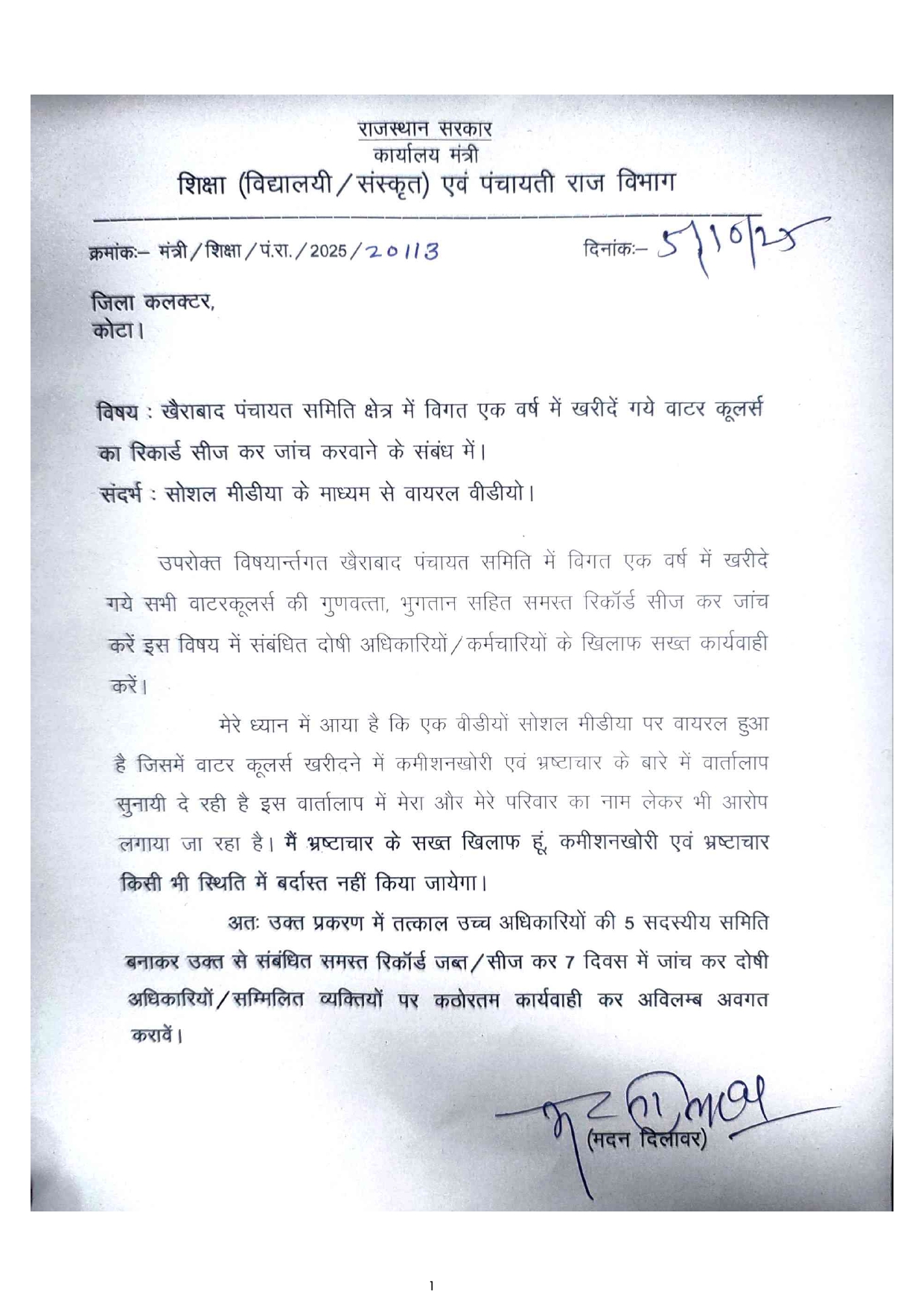 मंत्री दिलावर ने इस संदर्भ में जिला कलेक्टर, कोटा को पत्र लिखकर कहा है कि खैराबाद पंचायत समिति में पिछले एक वर्ष में खरीदे गए सभी वाटर कूलरों की गुणवत्ता, भुगतान और समस्त रिकॉर्ड को तत्काल सीज कर जांच की जाए। उन्होंने पत्र में स्पष्ट रूप से कहा कि यदि जांच में किसी भी प्रकार की अनियमितता, कमीशनखोरी या भ्रष्टाचार पाया जाता है, तो दोषी अधिकारियों, कर्मचारियों और अन्य संबंधित व्यक्तियों के खिलाफ कठोरतम प्रशासनिक कार्रवाई की जाए।