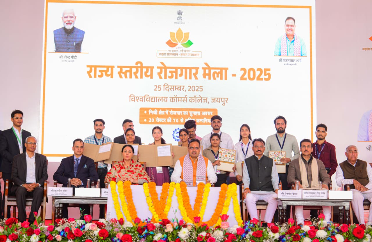 जयपुर: राजस्थान सरकार के दो वर्ष पूरे होने के अवसर पर जयपुर में आयोजित राज्य स्तरीय रोजगार मेला 2025 में मुख्यमंत्री भजनलाल शर्मा ने कहा कि राज्य सरकार रोजगार, कौशल और उद्यमिता को सर्वोच्च प्राथमिकता दे रही है। उन्होंने बताया कि अब तक प्रदेश में लगभग 92 हजार सरकारी नौकरियां दी जा चुकी हैं, जबकि 1.53 लाख से अधिक पदों पर भर्ती प्रक्रिया जारी है। इसके साथ ही निजी क्षेत्र में भी 2 लाख से अधिक युवाओं को रोजगार मिला है।