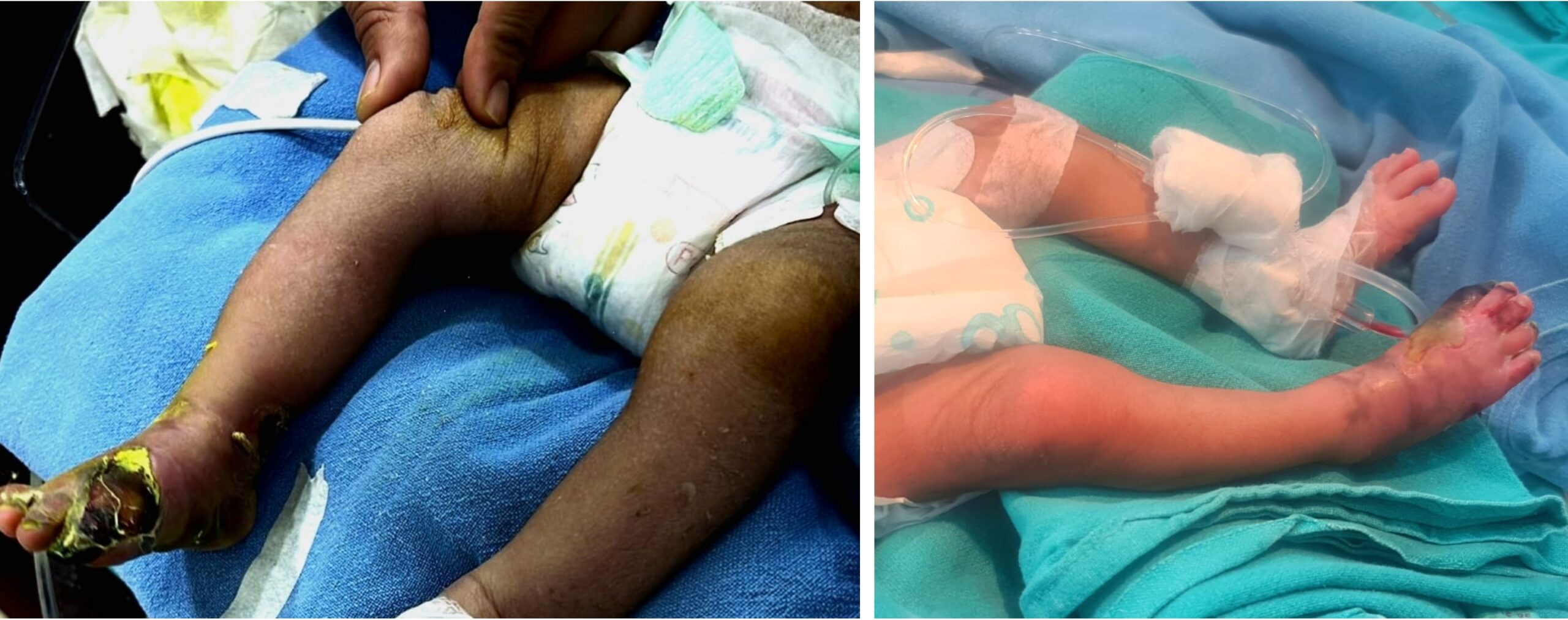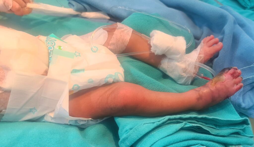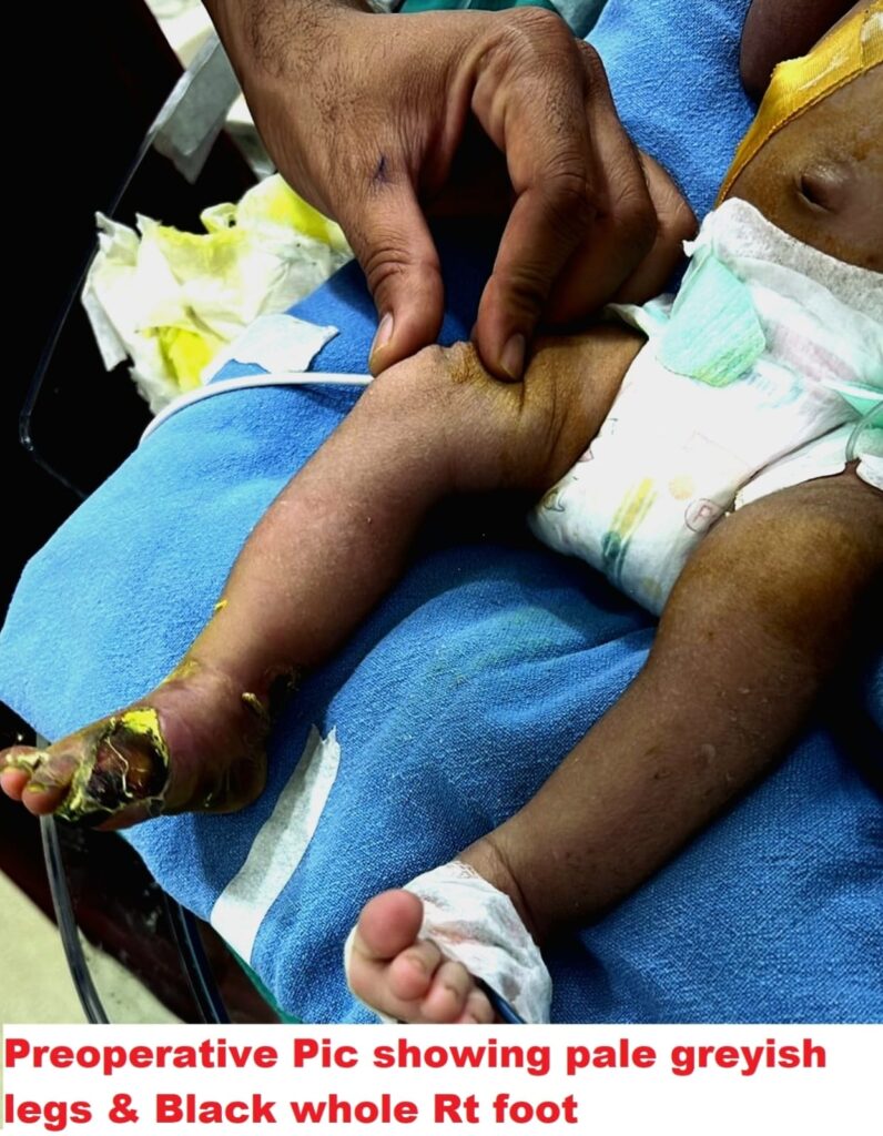Baby Mohini ,2.8 kg ,15 days’ old arrived in Jaipur Fortis Hospital surgical ICU in very critical condition from another hospital with a diagnosis of aortic thrombosis extending into both lower limbs causing impending right foot gangrene. His both legs were cold and clammy with no femoral /distal palpable pulsations up to both feet. Legs also showed poor capillary refilling while right foot was almost greyish black proximally but toe was completely black (Fig 1). According to Dr Sunil Kaushal, Patient was very dull and feverish with almost no urine output since last 24 hours.