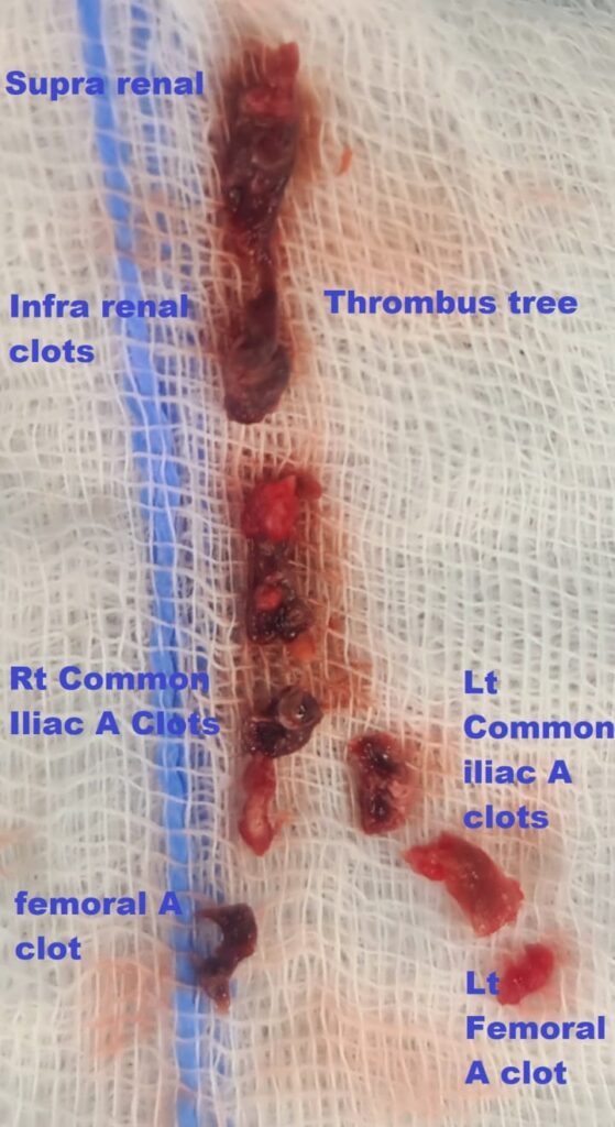 Dr Kaushal says, C.T angiography and color Doppler ultrasound suggested almost complete blockage of descending aorta from supra renal segment down to common iliac and upper femoral arteries on both the sides. As this dreadful aortic thrombosis was not sufficing, he was also found to be strongly Covid +ve with very high D-dimer levels. As he was already being treated conservatively at a govt hospital by anti-coagulant medicines since last 5 days. we went ahead with surgery straight way after explaining risk to the family.