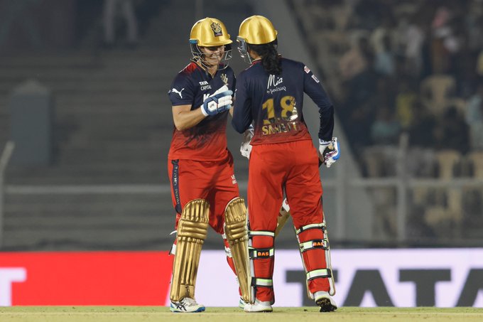 202 रन के टारगेट का पीछा करने उतरी बेंगलुरु को कप्तान स्मृति मंधाना और सोफी डिवाइन ने तेज शुरुआत दिलाई। मंधाना छठे ओवर में 18 रन बनाकर आउट हो गईं। उनके जाने के बाद सोफी डिवाइन ने एलिस पेरी के साथ पारी आगे बढ़ाई। पावरप्ले में बेंगलुरु का स्कोर एक विकेट के नुकसान पर 59 रन था।