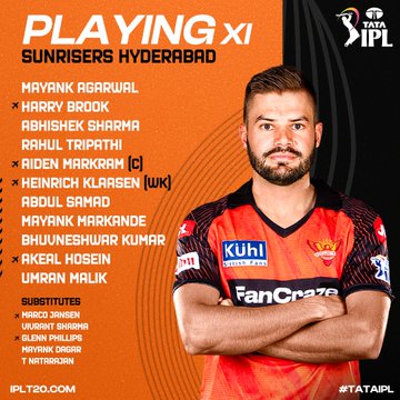 सनराइजर्स हैदराबाद: हैरी ब्रूक, मयंक अग्रवाल, राहुल त्रिपाठी, ऐडन मार्करम (कप्तान), हेनरिक क्लासेन (विकेटकीपर), अभिषेक शर्मा, अब्दुल समद, अकील हौसेन, भुवनेश्वर कुमार, मयंक मारकंडे और उमरान मलिक।