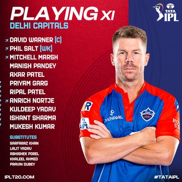 दिल्ली कैपिटल्स: डेविड वॉर्नर (कप्तान), फिल साल्ट (विकेटकीपर), मिचेल मार्श, मनीष पांडे, प्रियम गर्ग, अक्षर पटेल, रिपल पटेल, कुलदीप यादव, एनरिक नॉर्त्या, ईशांत शर्मा और मुकेश कुमार।