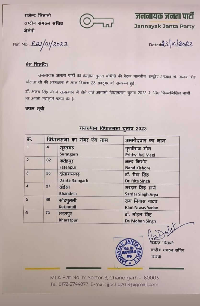 संगठन के राष्ट्रीय संगठन सचिन राजेंद्र लितानी ने 6 उम्मीदवारों की सूची जारी की है। इस सूची के मुताबिक विधानसभा चुनाव के लिए फतेहपुर से पूर्व केंद्रीय मंत्री सुभाष महरिया के भाई नंदकिशोर महरिया को, दांतारामगढ़ से कांग्रेस के प्रदेश अध्यक्ष नारायण सिंह के बेटे और कांग्रेस विधायक वीरेन्द्र सिंह की पत्नी डॉ. रीटा सिंह को खंडेला से सरदार सिंह आर्य को , सूरतगढ़ से पृथ्वीराज मील को कोटपूतली से रामनिवास यादव को और भरतपुर से डॉ. मोहन सिंह को प्रत्याशी घोषित किया है।