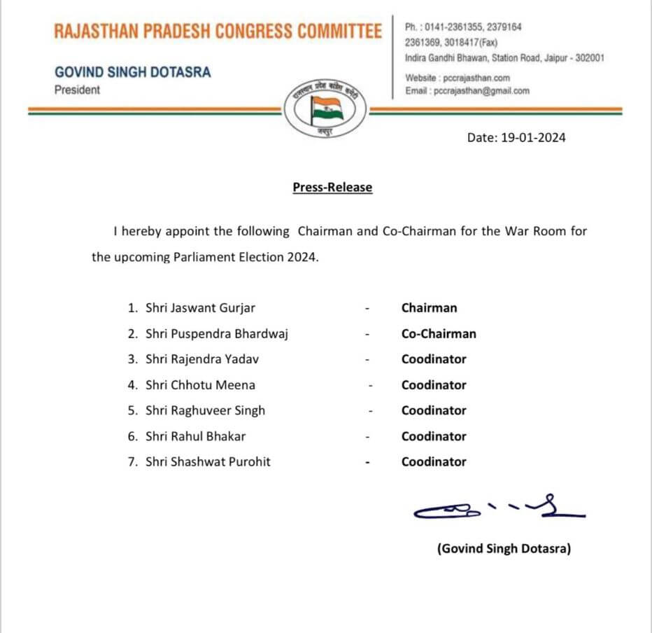 प्रदेश कांग्रेस वार रूम में कांग्रेस के महामंत्री जसवंत गुर्जर को चेयरमेन जसवंत गुर्जर बनाया है। कांग्रेस के महासचिव को उप चेयरमेन पुष्पेंद्र भारद्वाज और राजेंद्र यादव, छोटू मीणा,रघुवीर सिंह, राहुल भास्कर और शाश्वत पुरोहित कोआर्डिनेटर नियुक्त किया है।
