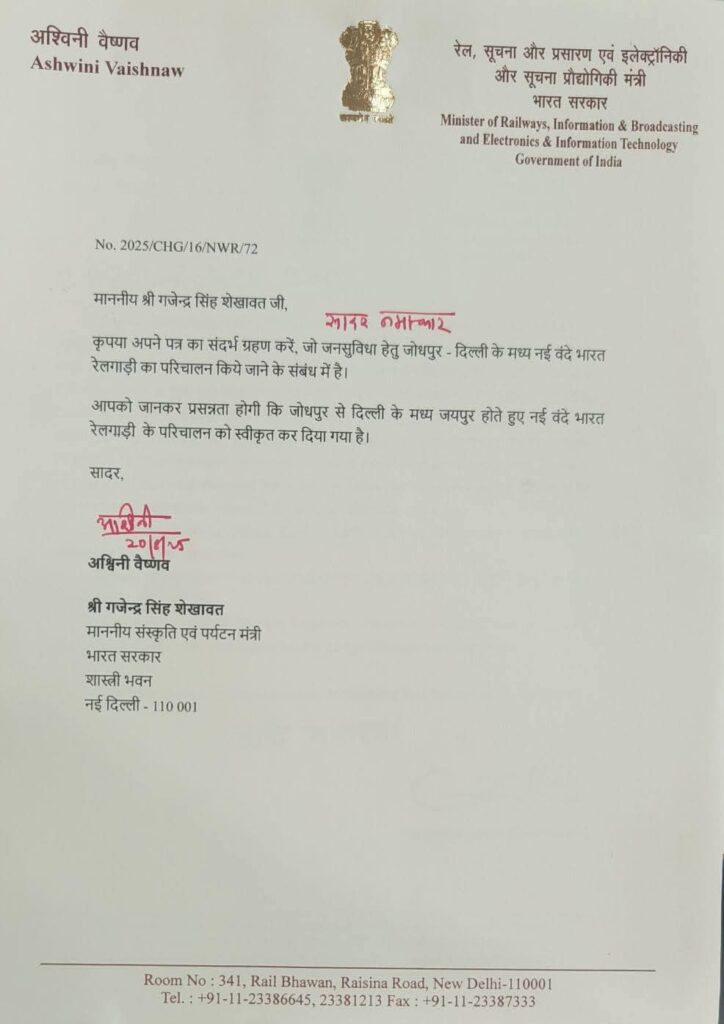 जोधपुर/नई दिल्ली, 21 अगस्त। जोधपुर के लिए यह खुशखबर है। केंद्रीय संस्कृति एवं पर्यटन मंत्री गजेन्द्र सिंह शेखावत के प्रयासों से जोधपुर-दिल्ली वंदे भारत ट्रेन के संचालक को मंजूरी मिल गई है। इस बाबत रेल मंत्री अश्विनी वैष्णव ने शेखावत को पत्र भेजकर अवगत कराया। जोधपुर से दिल्ली के लिए नई वंदे भारत ट्रेन जयपुर से होकर जाएगी।