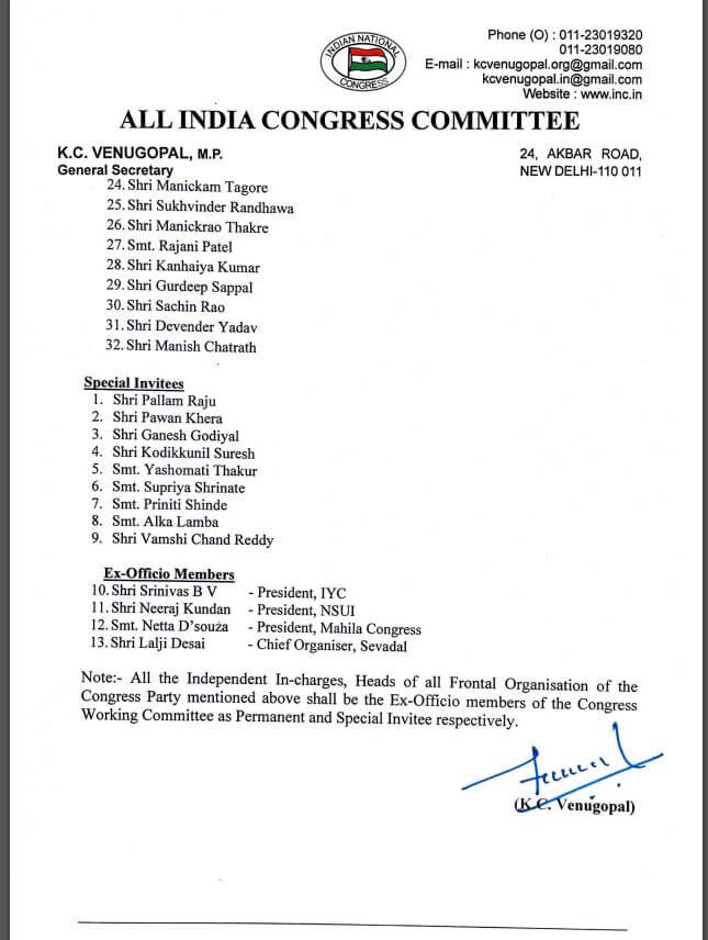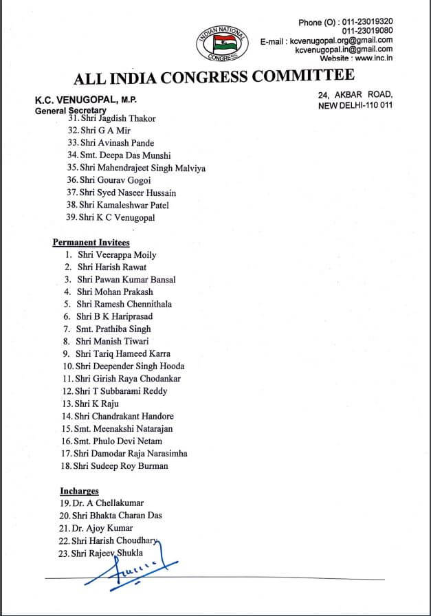 खड़गे की रविवार को घोषित कमेटी में चुनावी राज्य मध्य प्रदेश से कमलेश्वर पटेल और छत्तीसगढ़ से ताम्रध्वज साहू को जगह दी गई है। कुल 84 नाम हैं। इनमें CWC मेंबर, स्थायी आमंत्रित, महासचिव, विशेष आमंत्रित और प्रभारियों के नाम शामिल हैं। नीचे दी गई टेबल में इनका ब्यौरा