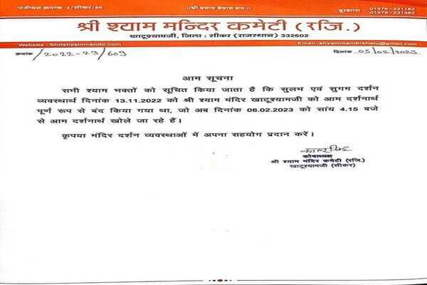 उल्लेखनीय है कि 22 फरवरी से शुरू होने वाले बाबा श्याम का वार्षिक मेले की तैयारियों को लेकर जिला प्रशासन के निर्देश पर मंदिर दर्शन बंद किए गए थे। इस दौरान श्रद्धालुओं के लिए प्रवेश और बाहर निकलने के लिए रास्ते नए बनाए गए हैं।जिला प्रशासन की अनुमति के बाद 6 फरवरी से मंदिर खोलने का निर्णय खाटू श्याम मंदिर कमेटी द्वारा किया गया है।