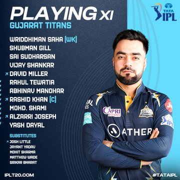 गुजरात टाइटंस: राशिद खान (कप्तान), शुभमन गिल, रिद्धिमान साहा (विकेटकीपर), साई सुदर्शन, विजय शंकर, राहुल तेवतिया, डेविड मिलर, अभिनव मनोहर, मोहम्मद शमी, यश दयाल और अल्जारी जोसेफ।