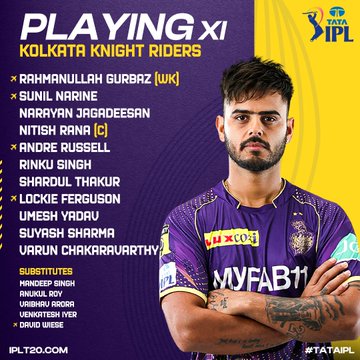 कोलकाता नाइट राइडर्स: नीतीश राणा (कप्तान), रहमानुल्लाह गुरबाज (विकेटकीपर), नरायण जगदीशन, रिंकू सिंह, आंद्रे रसेल, शार्दूल ठाकुर, सुनील नरेन, लोकी फर्ग्युसन, सुयश शर्मा, उमेश यादव और वरुण चक्रवर्ती।