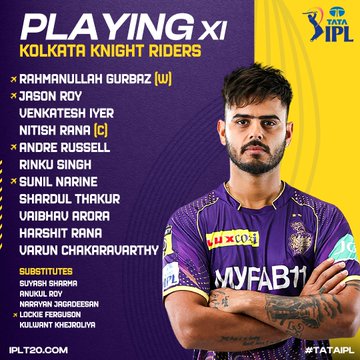 कोलकाता नाइट राइडर्स : नीतीश राणा (कप्तान), जेसन रॉय, रहमानुल्लाह गुरबाज, वेंकटेश अय्यर, आंद्रे रसेल, सुनील नरेन, रिंकू सिंह, वैभव अरोड़ा, शार्दूल ठाकुर, हर्षित राणा और वरुण चक्रवर्ती।