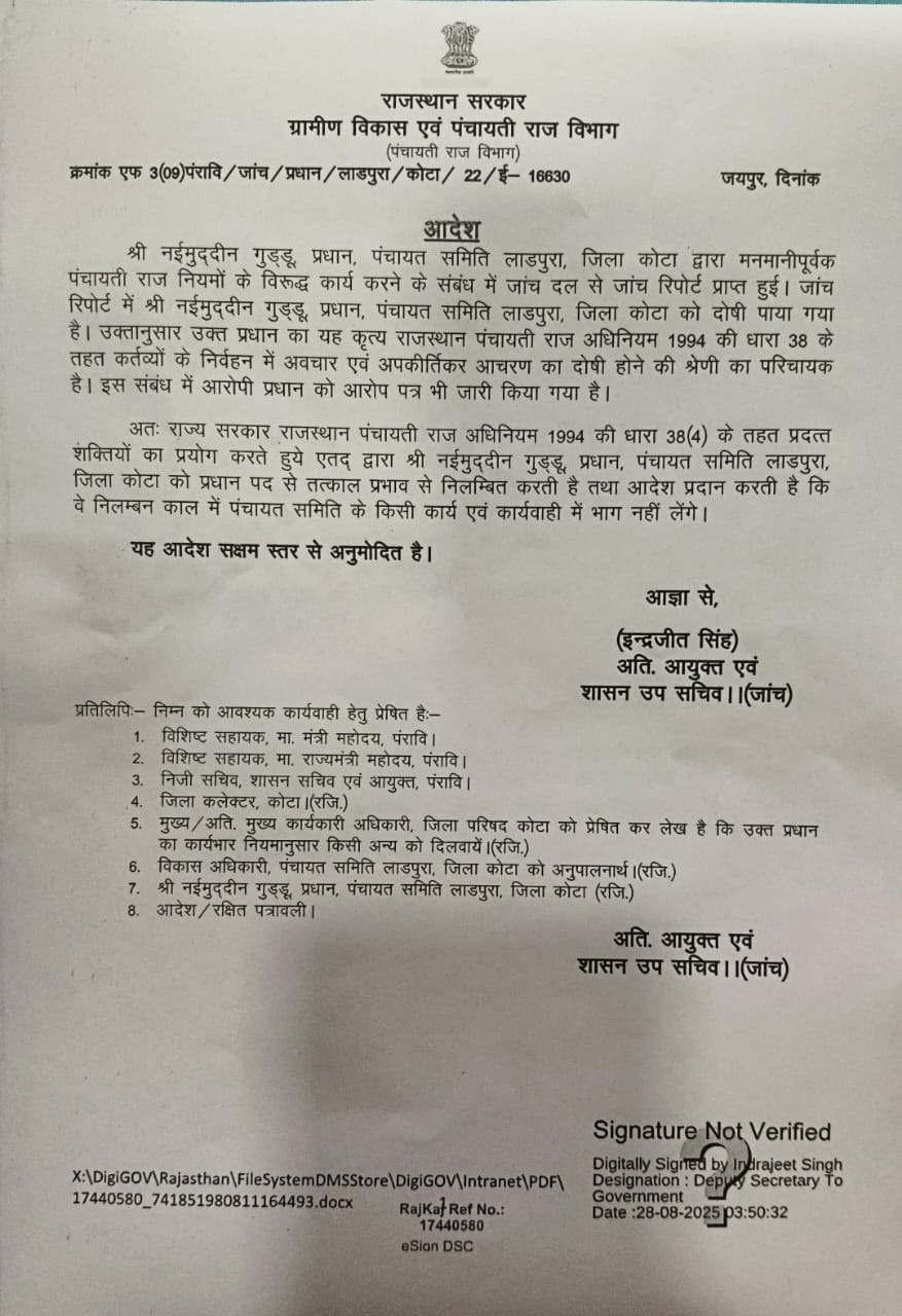 अतिरिक्त आयुक्त एवं शासन उप सचिव (जांच) इंद्रजीत सिंह द्वारा जारी आदेश में कहा गया है कि नईमुद्दीन गुड्डू प्रधान पंचायत समिति लाडपुरा जिला कोटा के खिलाफ प्राप्त जांच में उनके द्वारा मनमानी पूर्वक पंचायती राज नियमों के विरुद्ध कार्य करने की पुष्टि हुई है तथा प्रधान नईमुद्दीन गुड्डू को पंचायती राज नियमों के विरुद्ध कार्य करने का दोषी पाया गया। उक्त प्रधान का यह कृत्य राजस्थान पंचायती राज अधिनियम 1994 की धारा 38 के तहत कर्तव्य को निर्वहन में अवचार व अपकीर्तिकर आचरण का दोषी होने की श्रेणी का परिचायक है। इस संबंध में आरोपी प्रधान को आरोप पत्र भी जारी किया गया है।