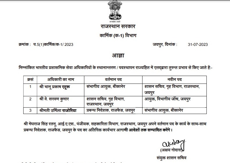 IAS मेघराज रतनू को प्रबंध निदेशक राजफैड का अतिरिक्त कार्यभार