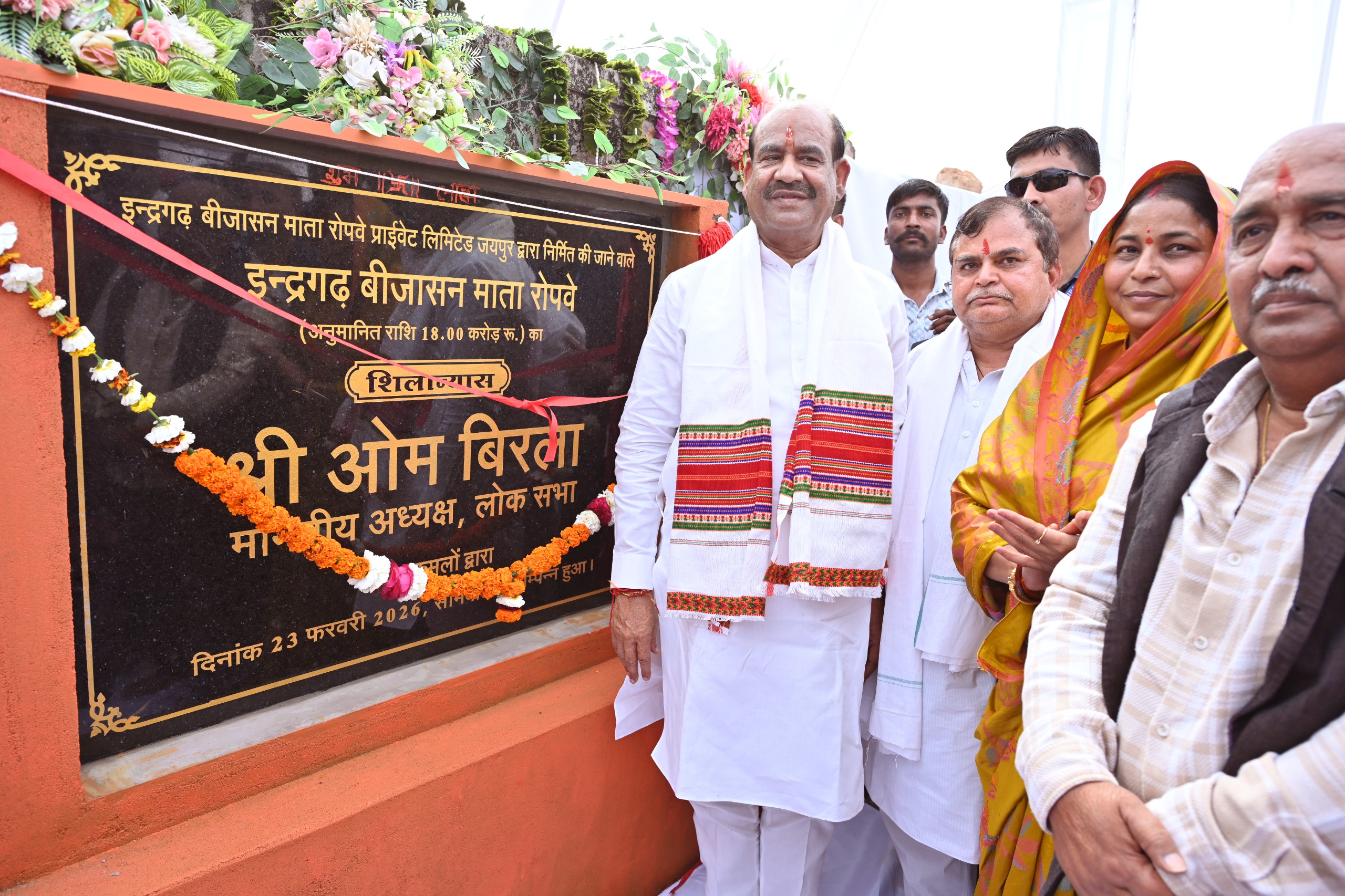 इन्द्रगढ़ (बून्दी), 23 फरवरी। लोकसभा अध्यक्ष ओम बिरला ने इन्द्रगढ़ स्थित प्राचीन माँ बीजासन मंदिर में 18 करोड़ रूपए की लागत से बनने वाले रोप-वे तथा 62 करोड़ रूपए की लागत से निर्मित बांसी-देई-खजूरी-करवर-इन्द्रगढ़ सड़क सहित कुल 103 करोड़ रूपए के विकास कार्यों का शिलान्यास और लोकार्पण किया। इसके अलावा बिरला ने केशवराय पाटन पंचायत समिति क्षेत्र में 32.50 करोड़ रूपए की लागत से 44 विकास कार्यों का लोकार्पण और शिलान्यास किया।