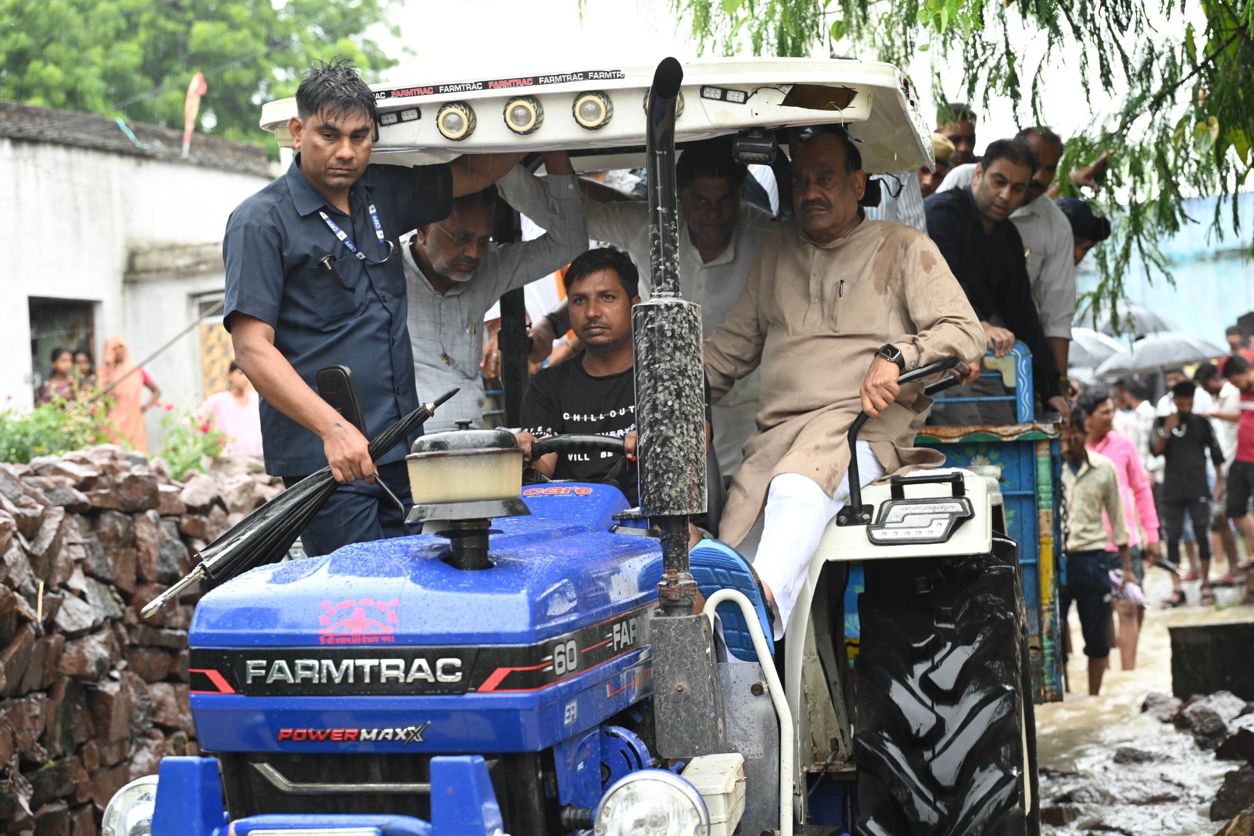 कोटा। लगातार हो रही बारिश से क्षेत्र में जनजीवन अस्त व्यस्त हो चुका है। खेतों में जलभराव से फसलों को नुकसान हुआ है तो लोगों के मकान भी क्षतिग्रस्त हुए हैं। बारिश के कारण बिगड़े हालात तथा आमजन को हुए नुकसान का जायजा लेने लोकसभा अध्यक्ष ओम बिरला ने शुक्रवार को दिगोद क्षेत्र का दौरा किया। इस दौरान वे ऊर्जा मंत्री हीरालाल नागर व जिला प्रशासन के साथ निमोदा हरिजी व आसपास के गांवों में पहुंचे। दीगोद से निमोदा के बीच जलभराव के कारण स्पीकर बिरला सेना के ट्रक औऱ ट्रेक्टर पर सवार होकर प्रभावितों तक पहुंचे।