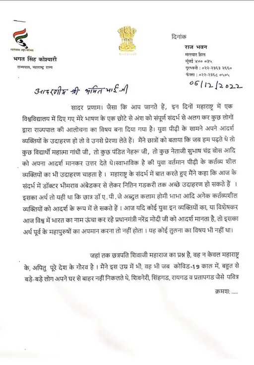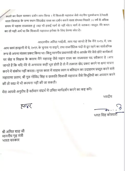 मुंबई :- अपने बयानों को लेकर लगातार विवादों में रहने वाले महाराष्ट्र के गवर्नर भगत सिंह कोश्यारी ने गृहमंत्री अमित शाह को चिट्ठी लिखकर मार्गदर्शन मांगा है। उन्होंने गृहमंत्री से सलाह मांगी है कि उन्हें इस पद पर बने रहना है या नहीं। कोश्यारी ने यह चिट्ठी 6 दिसंबर को लिखी थी, जो अब सामने आई है।