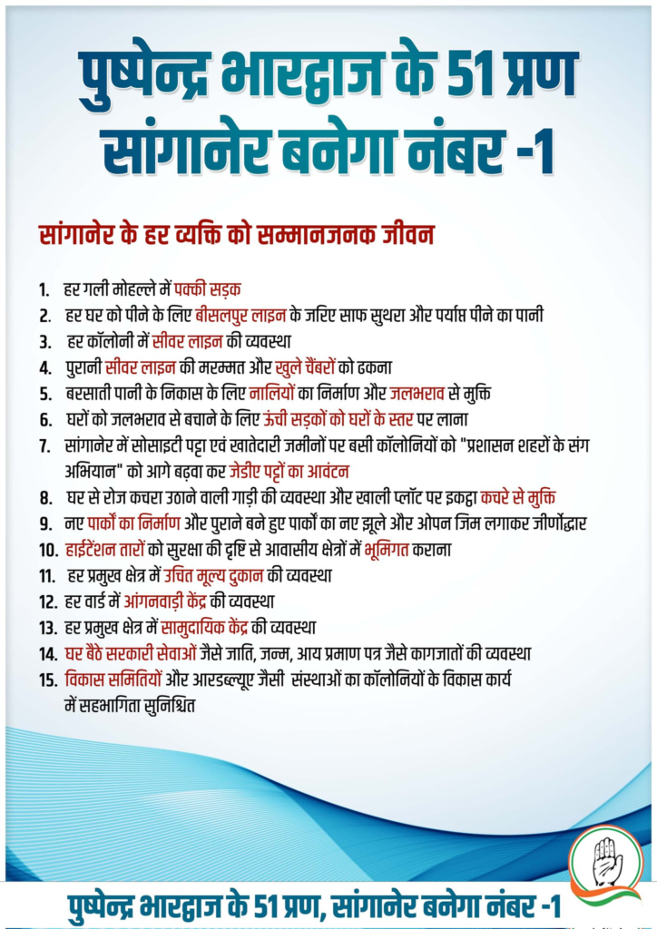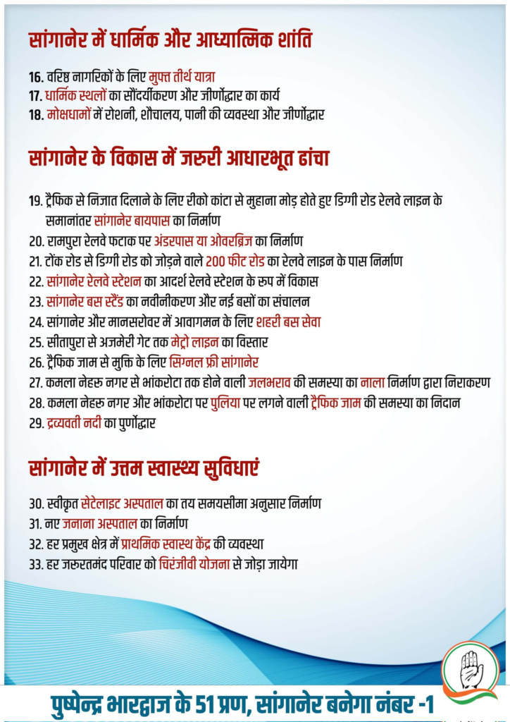 कांग्रेस के प्रत्याशी पुष्पेंद्र भारद्वाज ने कहा कि विधानसभा में धार्मिक स्थलों का सौंदर्यीकरण और जीर्णोद्वार कराया जाएगा। इसके अलावा सभी कॉलोनियों में बीसलपुर पेयजल लाइन, सीवर लाइन, सीतापुरा से अजमेर गेट तक मेट्रो लाइन का विस्तार, सांगानेर और मानसरोवर में शहरी शहरी बस सेवा सहित कई विकास के कार्य कराए जाएंगे। भारद्वाज ने बताया कि पूरे 5 साल की सक्रियता के चलते उन्हें गली गली की समस्याएं पता है और 5 दिन पहले सांगानेर आए भजनलाल को गलियों का भी नहीं पता।