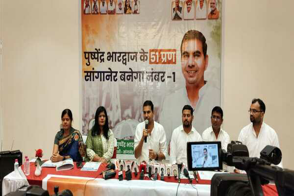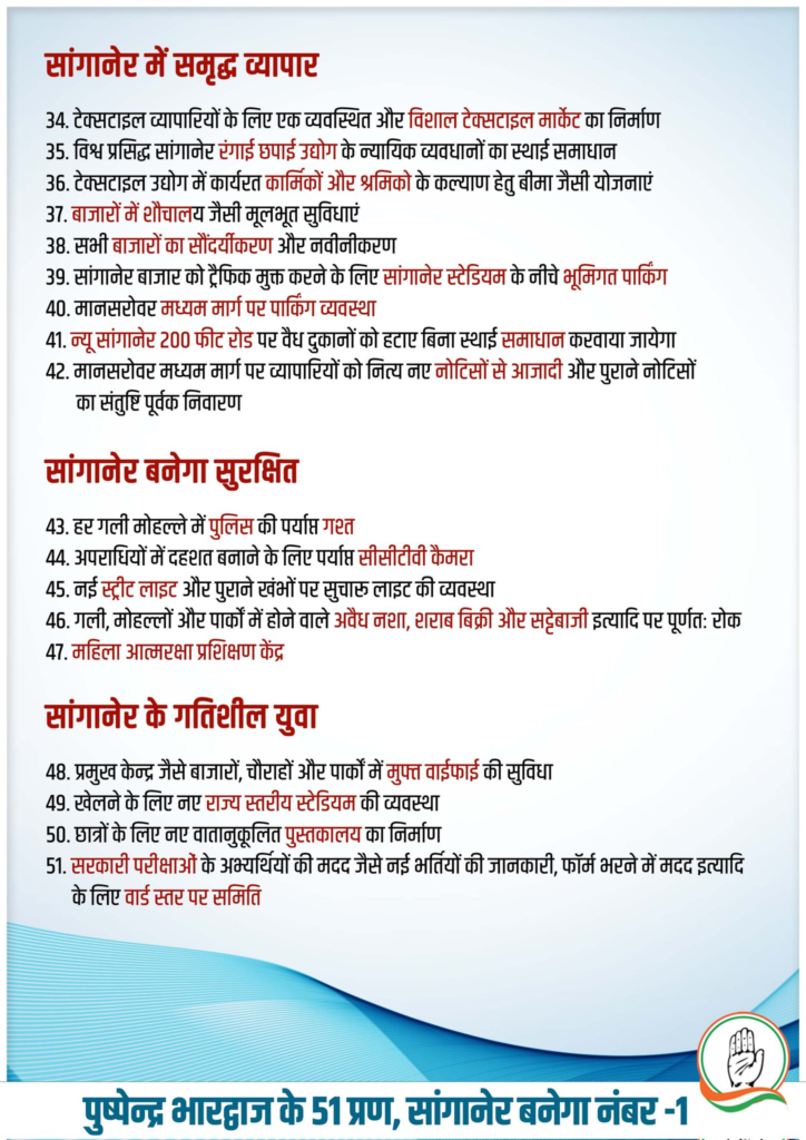 कांग्रेस के प्रत्याशी पुष्पेंद्र भारद्वाज ने कहा कि चुनाव जीतने पर वे सांगानेर में सैटेलाइट अस्पताल का तय समय में निर्माण करवाएंगे, विधानसभा में नया जनाना अस्पताल और प्रमुख क्षेत्रों में प्राथमिक स्वास्थ्य केन्द्र खुलवाएंगे। छात्रों के लिए वातानुकूलित पुस्तकालय का निर्माण कराएंगे। वहीं प्रमुख बाजारों और पार्कों में मुफ्त वाई-फाई की सुविधा देंगे। खिलाड़ियों के लिए राज्य स्तरीय स्टेडियम का निर्माण भी कराया जाएगा। कपड़ा व्यापारियों के लिए आधुनिक टैक्सटाइल पार्क बनवाएंगे। महिला आत्मरक्षा के लिए प्रशिक्षण केन्द्र सहित समस्त विधानसभा में सीसीटीवी कैमरे की व्यवस्था भी की जाएगी।