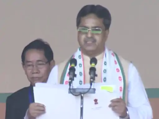 अगरतला:-त्रिपुरा में आज यानी बुधवार को मुख्यमंत्री माणिक साहा दूसरी बार CM पद की शपथ ली। इस दौरान प्रधानमंत्री नरेंद्र मोदी और अमित शाह भी मौजूद रहे। समारोह अगरतला के स्वामी विवेकानंद मैदान में हुआ। CM माणिक साहा के बाद उनकी कैबिनेट के 9 मंत्रियों ने भी शपथ ली।