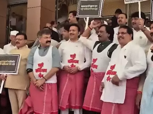 महाराष्ट्र विधानसभा के बाहर बुधवार को एक अनोखा विरोध प्रदर्शन देखने को मिला, जब महाविकास आघाड़ी (MVA) के विधायकों ने ‘लुंगी और बनियान’ पहनकर शिवसेना (शिंदे गुट) के विधायक संजय गायकवाड़ के खिलाफ प्रदर्शन किया।